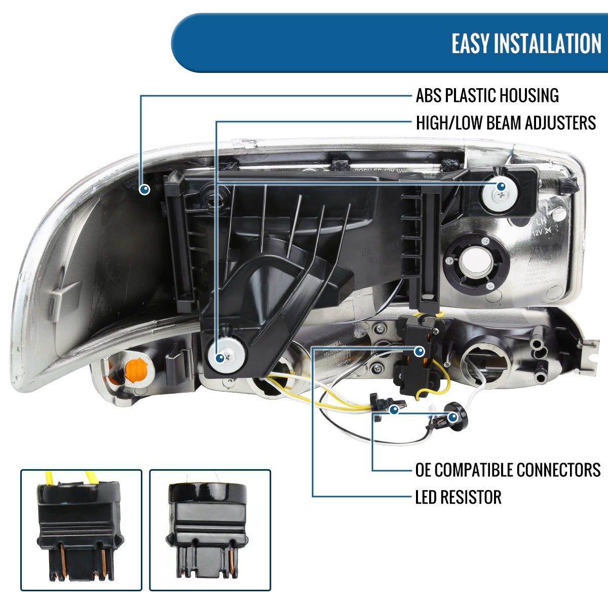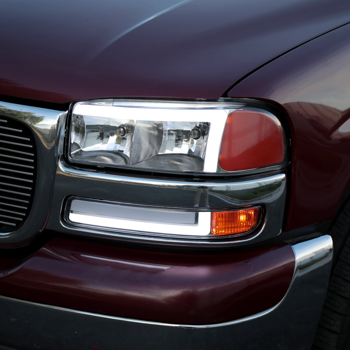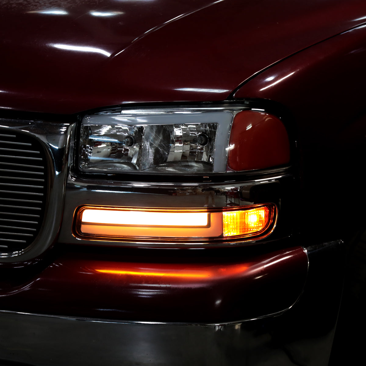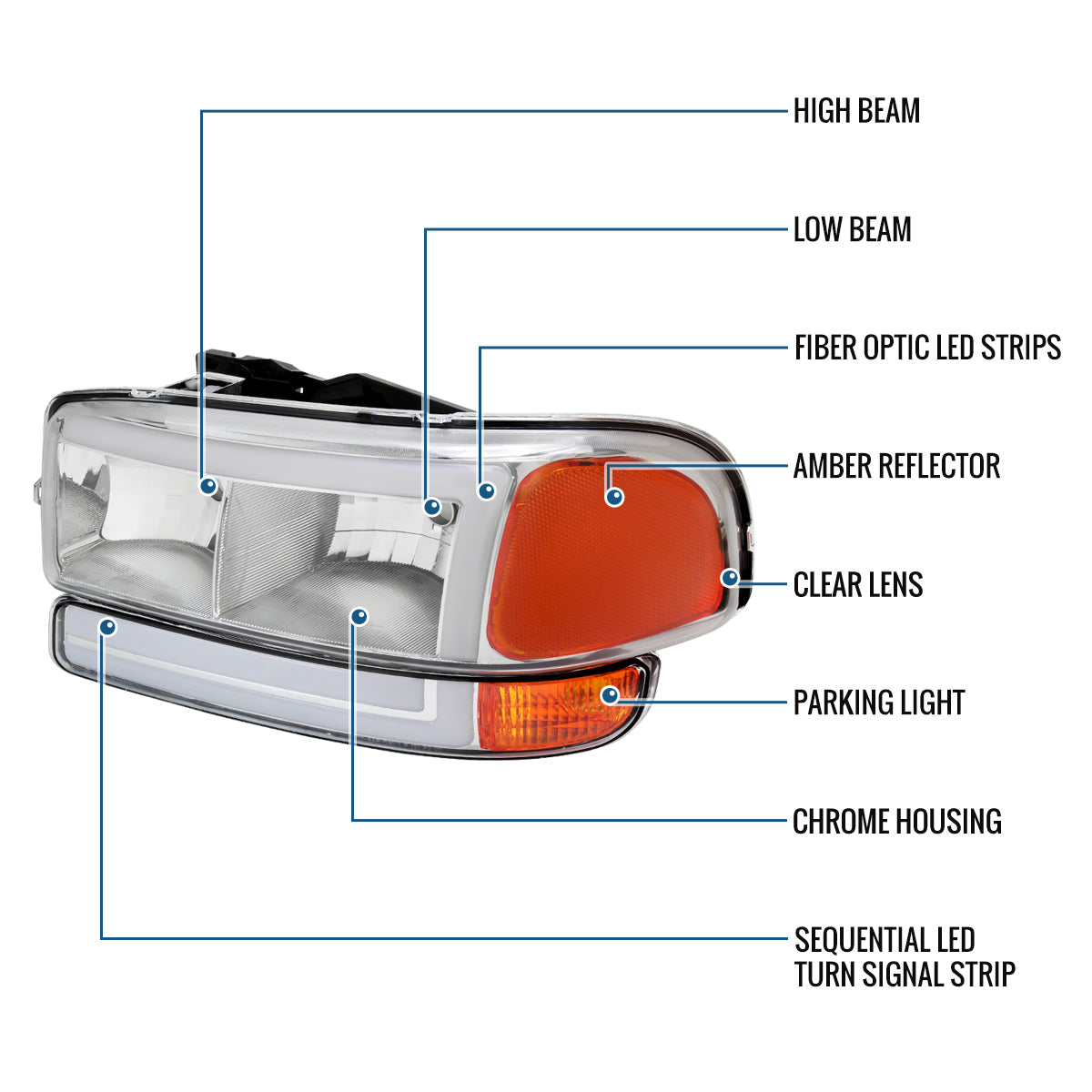 Ronnin - Fits 1999-2007 GMC Sierra 2000-2006 Yukon Upgraded Replacement LED Running Lights Sequential Turn Signals Headlights + Bumper Lights Assembly Pair | Chrome