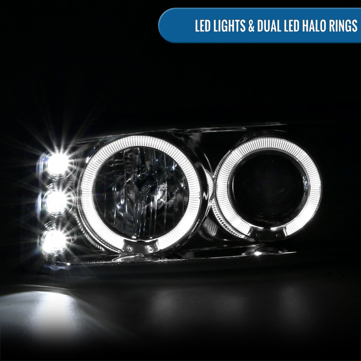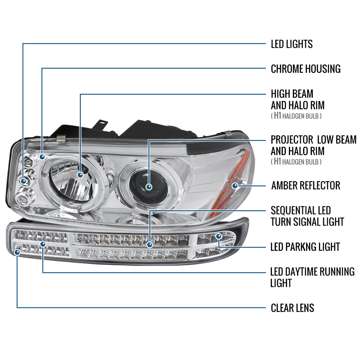 Ronnin - Fits 1999-2007 GMC Yukon XL Sierra Classic Upgraded Replacement LED Dual Halo Rims Running Lights Projector Headlights + Full LED Bumper Sequential Turn Signal Lamps Assembly Pair | Chrome