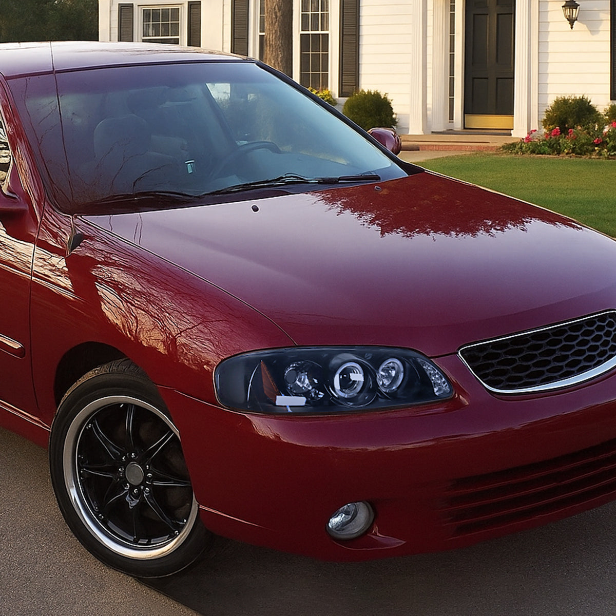 Ronnin - Fits 2000-2003 Nissan Sentra Upgrade Replacement LED Dual Rims Projector Headlights Assembly Pair | Black Smoke