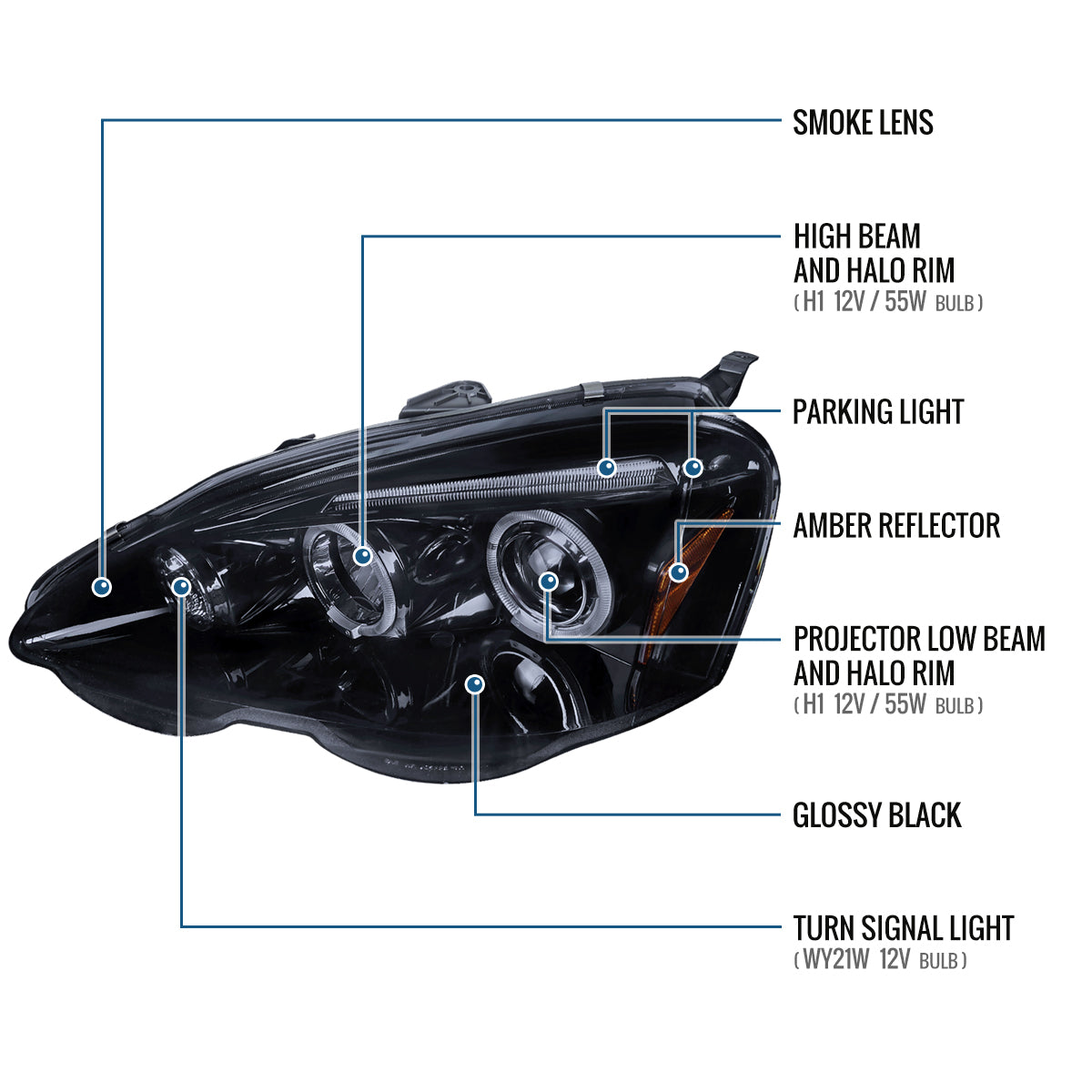 Ronnin - Fits 2002-2004 Acura RSX Upgraded LED Dual Rims Projector Headlights Assembly Pair | Black Smoke