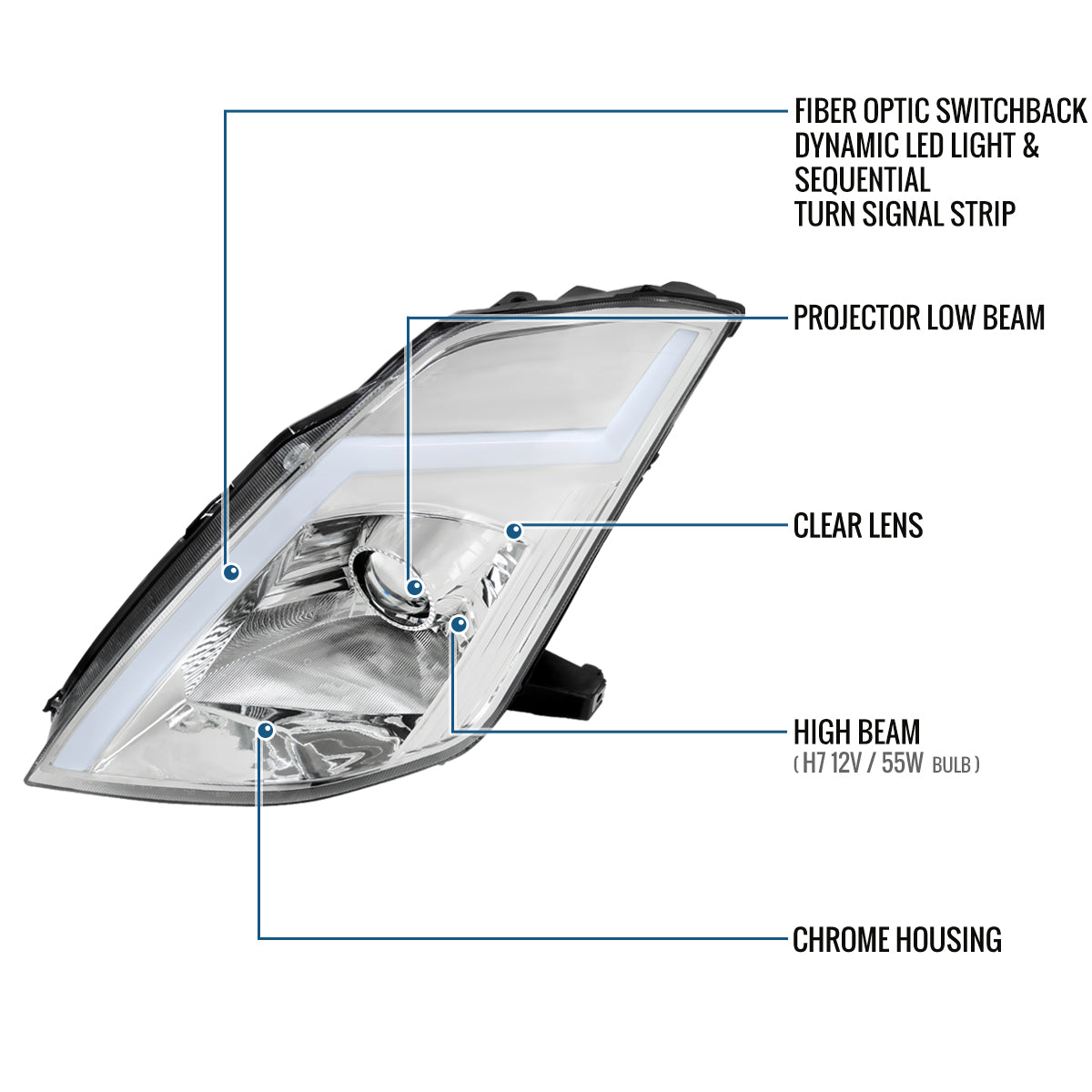 Ronnin - Fits 2003-2005 Nissan 350Z Upgraded Replacement HID Xenon Projector Headlights LED Switchback Sequential Turn Signals + Animated Startup Effect Assembly Pair | Chrome