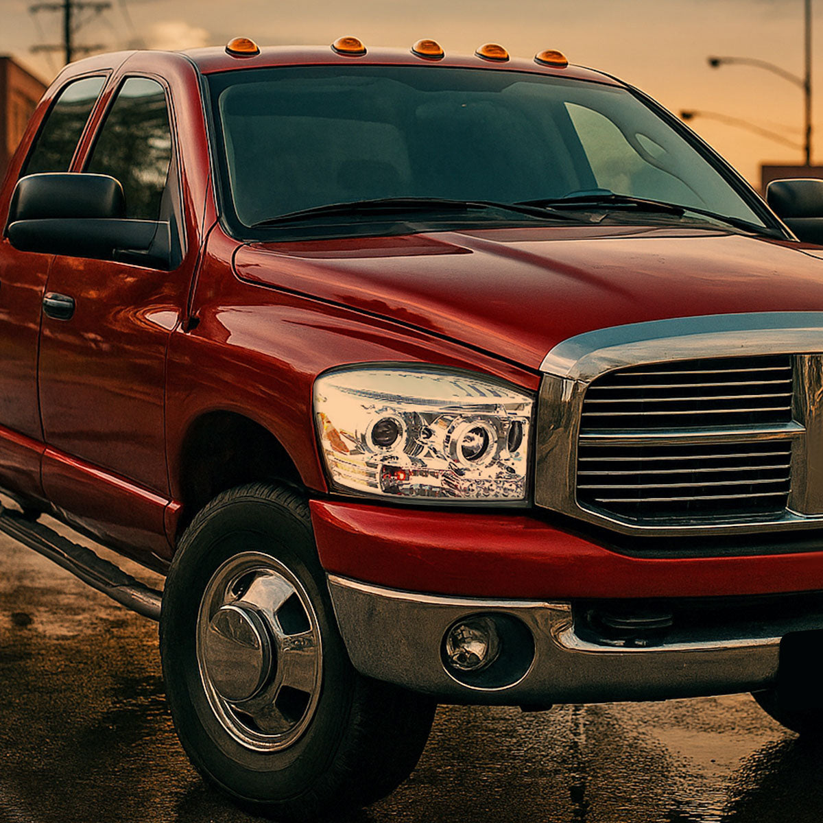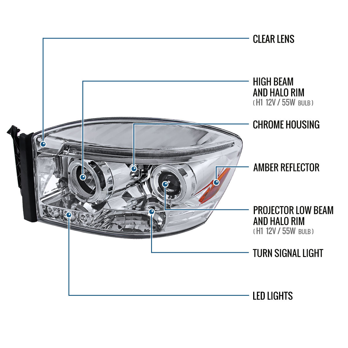 Ronnin - Fits 2006-2009 Dodge Ram 1500 2500 3500 Upgraded LED Dual Rims Projector Headlights Assembly Pair | Chrome