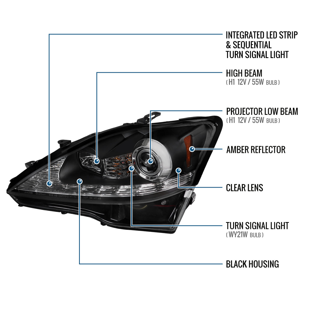 Ronnin - Fits 2006-2010 Lexus IS250 IS350 Upgrade LED Switchback Sequential Turn Signals Projector Halogen Headlights Assembly Pair | Black