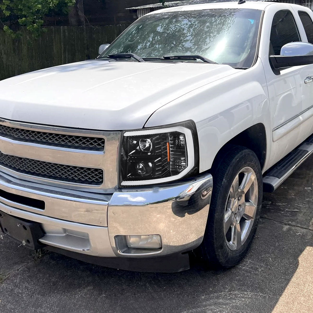 Ronnin - Fits 2007-2014 Chevy Silverado 1500 2500HD 3500HD Upgrade LED Running Light Tube Projector Headlights Assembly Pair | Gloss Black