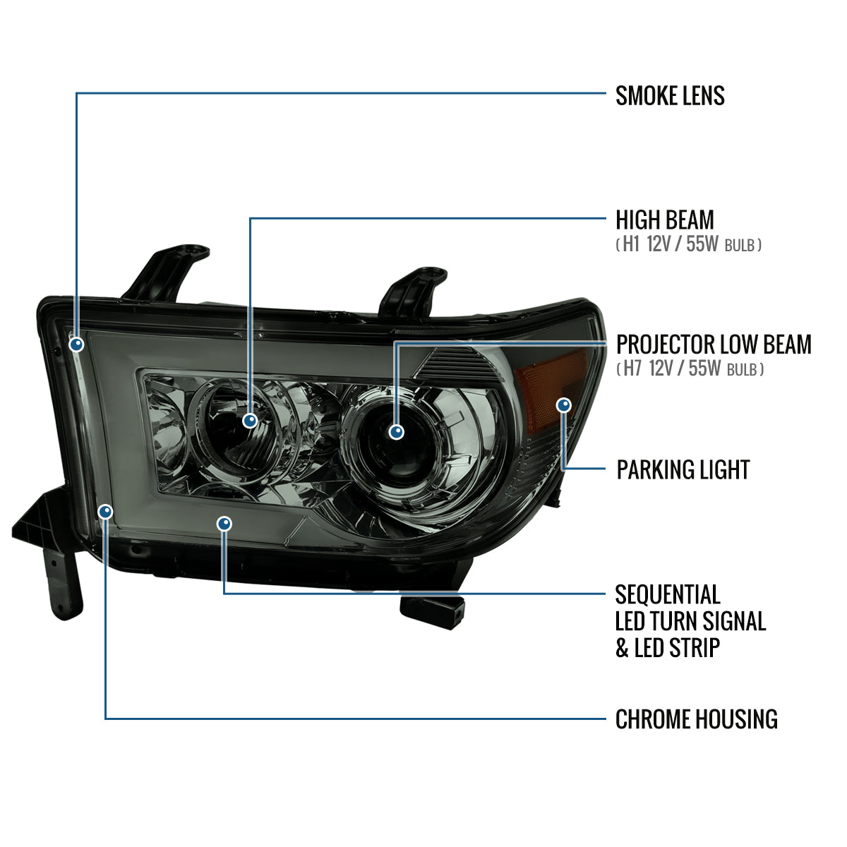 Ronnin - Fits 2007-2017 Toyota Tundra Sequoia Projector Headlights LED Switchback Sequential Turn Signals Replacement Assembly Pair | Smoke
