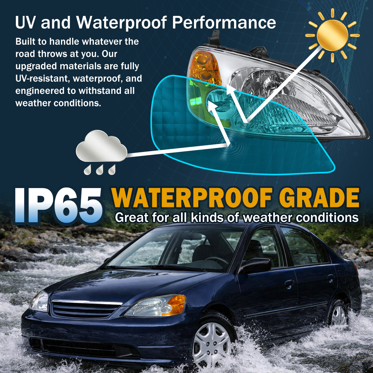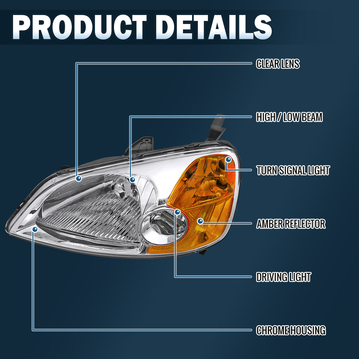 Ronnin - Fits 2001-2003 Honda Civic Coupe Sedan Factory Replacement Headlights Assembly Pair | Chrome