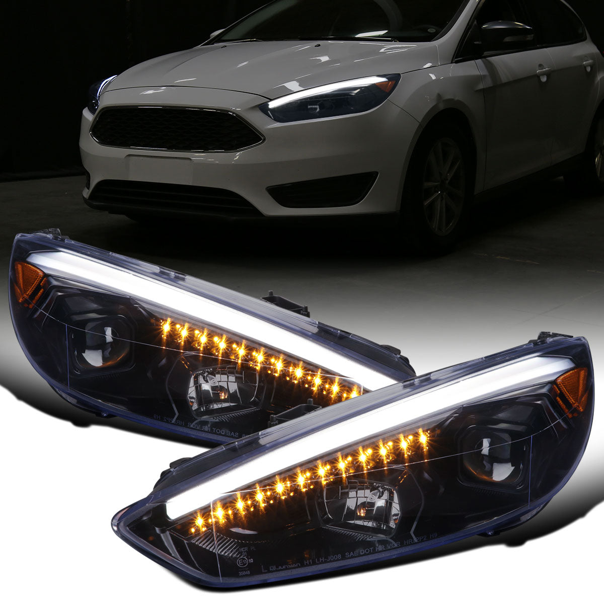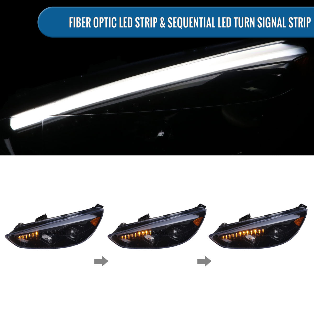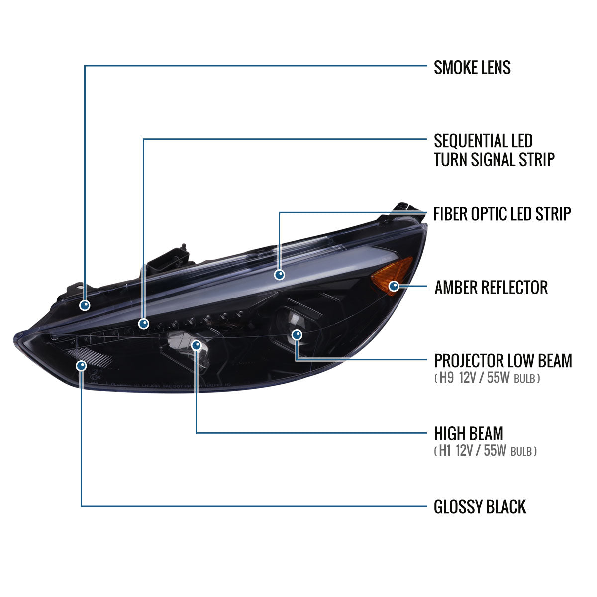 Ronnin - Fits 2015-2018 Ford Focus Upgrade Assembly LED Sequential Turn Signals Projector Headlights Pair | Black Smoke