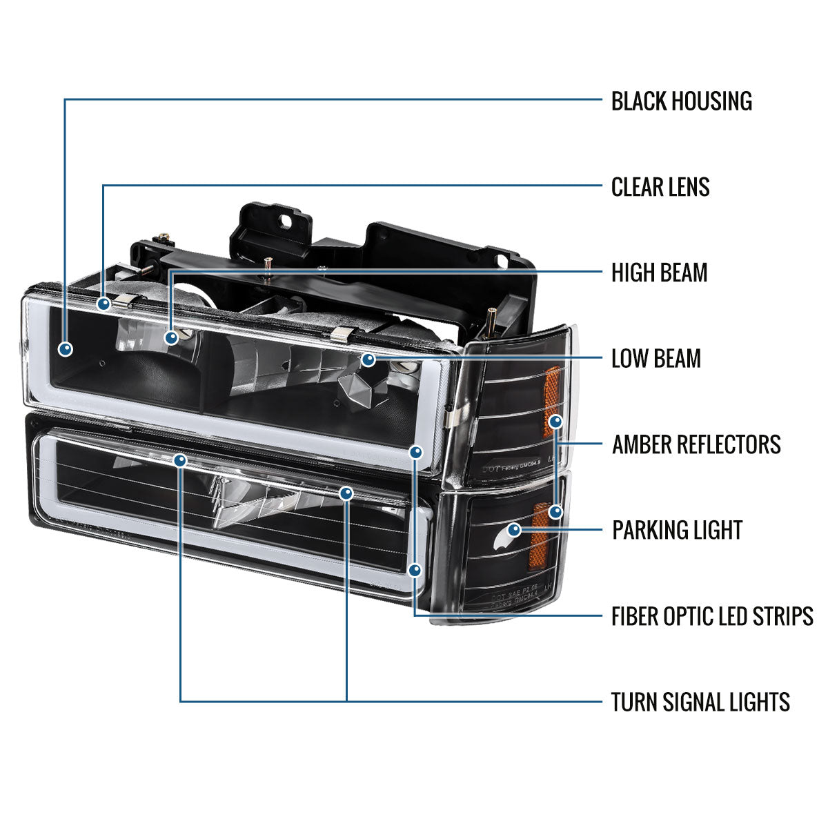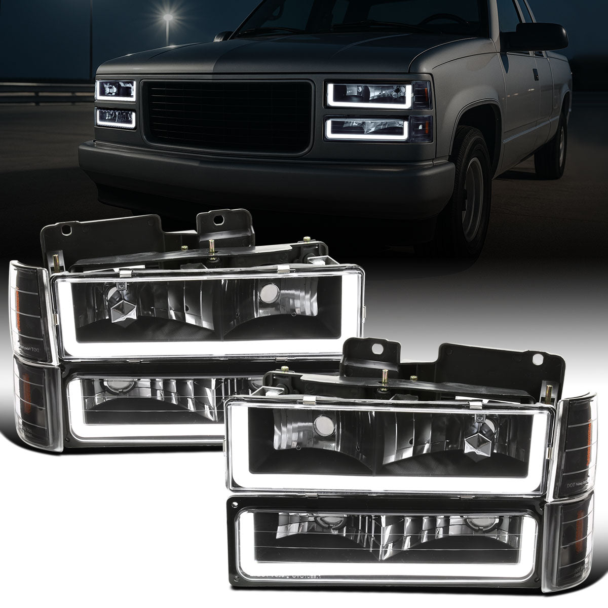 Ronnin - Fits 1994-1999 GMC C10 C/K Suburban Sierra Yukon LED Running Tube Lights Headlights + Corner Bumper Parking Lamps Replacement Set Pair | Black