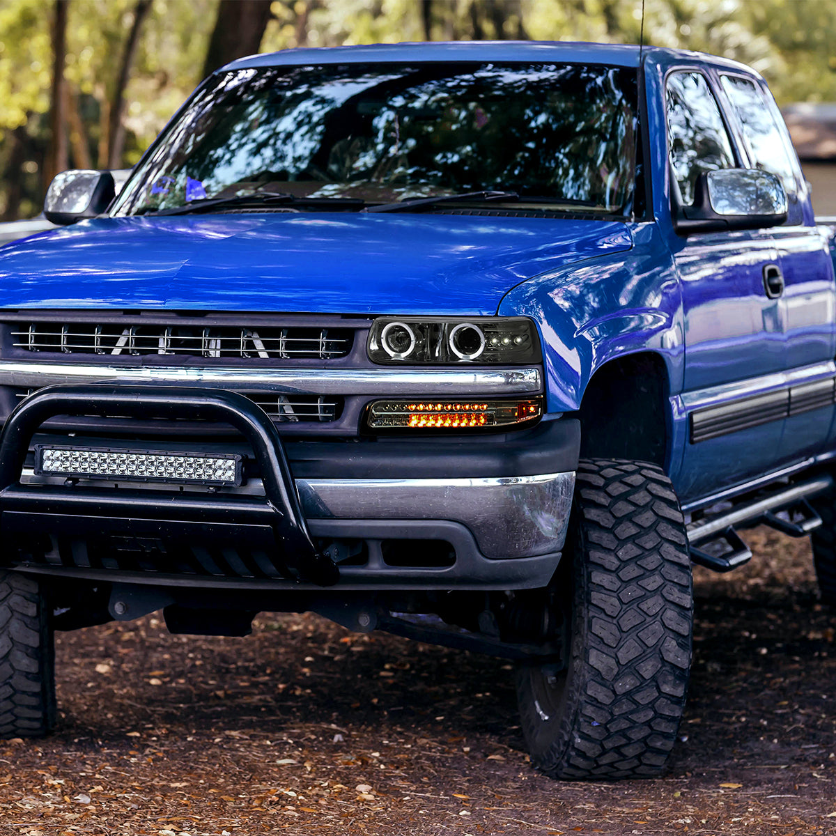 Ronnin - Fits 1999-2006 Silverado Suburban Tahoe Upgraded LED Dual Halo Rims Running Lights Projector Headlights Assembly Pair | Smoke