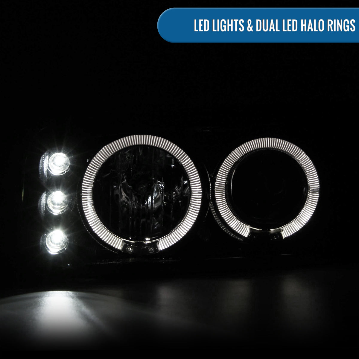 Ronnin - Fits 2000-2006 GMC Yukon XL Sierra Denali Upgraded LED Dual Halo Rims Running Lights Projector Headlights + Factory Style Bumper Lamps Assembly Pair | Black Smoke