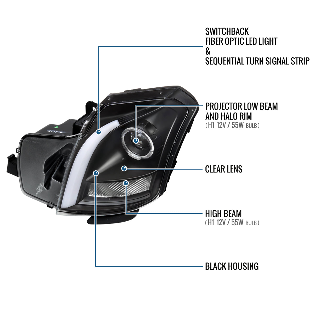 Ronnin - Fits 2003-2007 Cadillac CTS Upgraded Replacement LED Tube Switchback Sequential Turn Signal Halogen Projector Headlights Assembly Pair | Black
