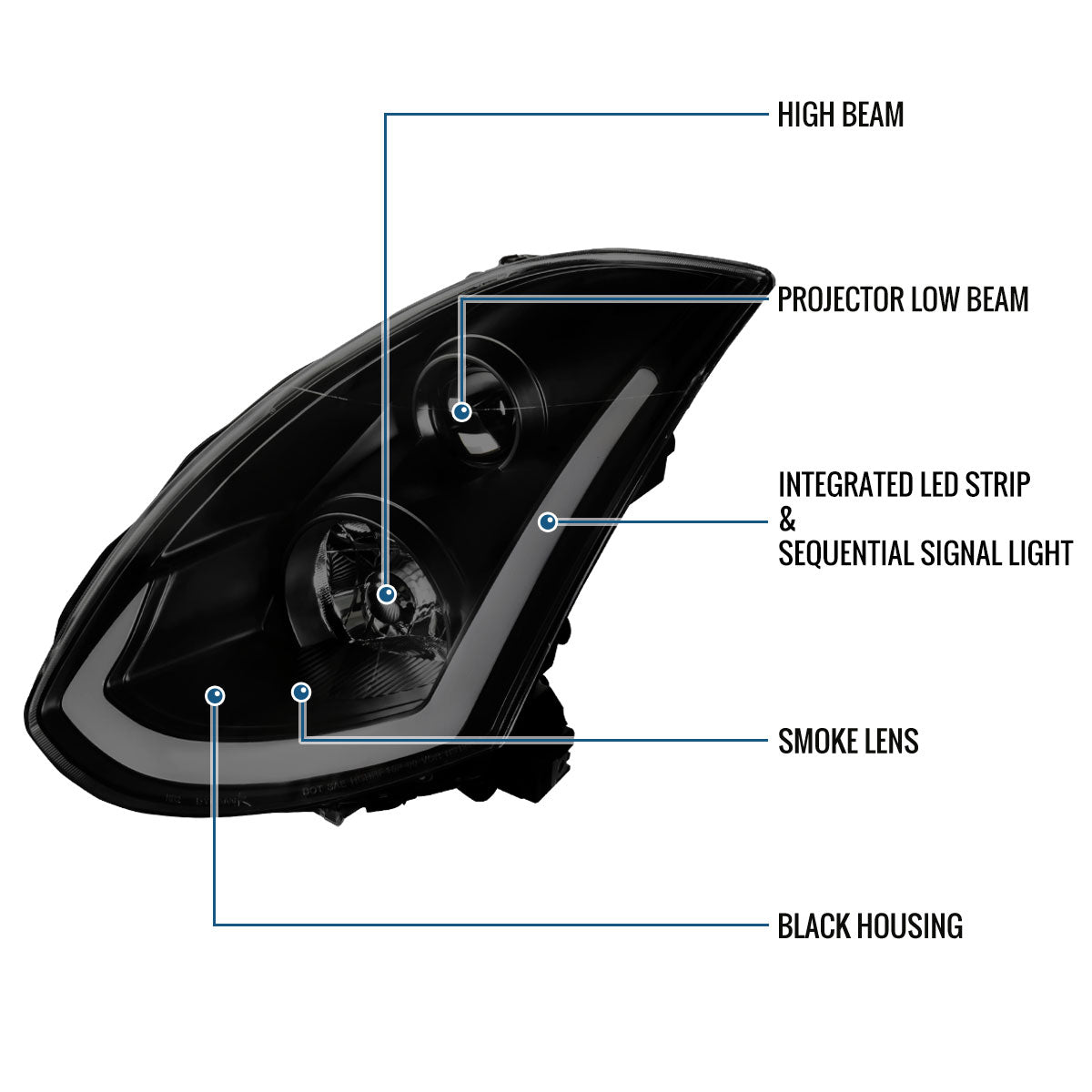 Ronnin - Fits 2003-2007 Infiniti G35 Coupe LED Switchback Sequential Turn Signals Xenon HID Projector Headlights Assembly Pair | Black Smoke