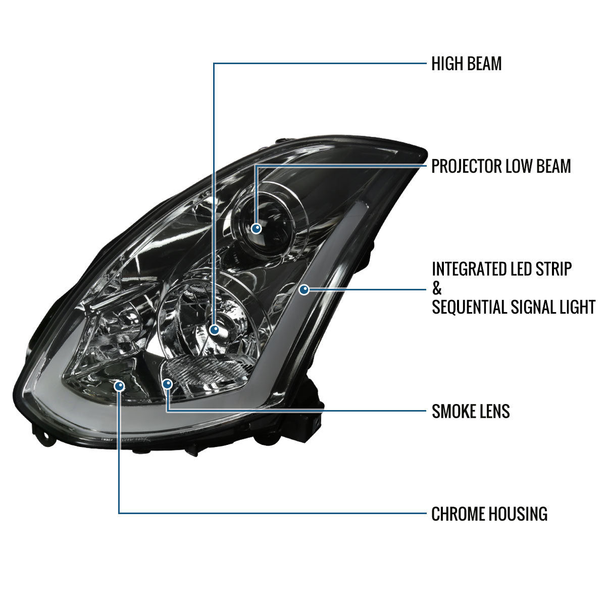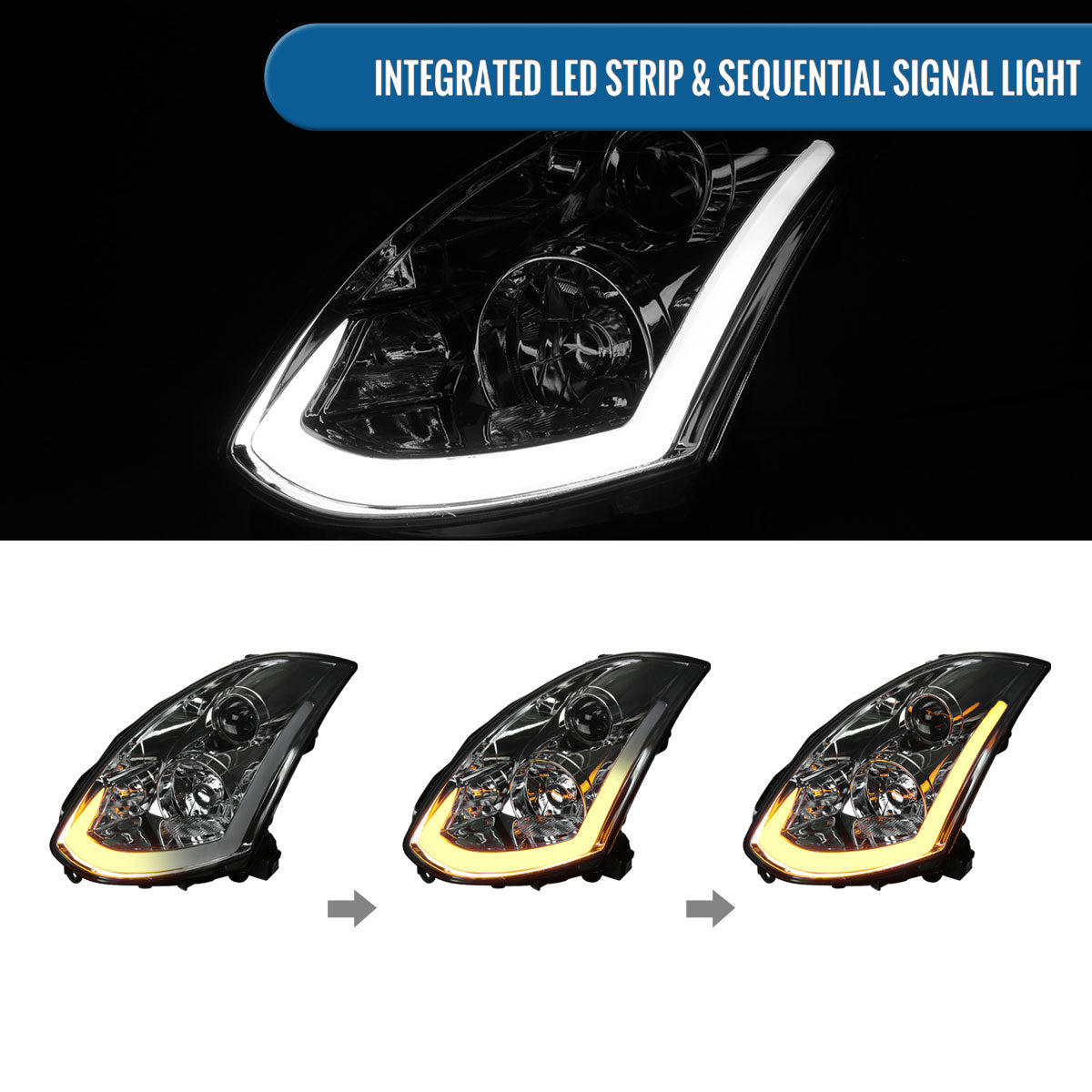 Ronnin - Fits 2003-2007 Infiniti G35 Coupe Upgraded Replacement LED Switchback Sequential Turn Signals Xenon HID Projector Headlights Assembly Pair | Smoke