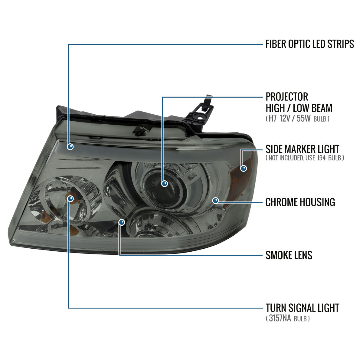 Ronnin - Fits 2004-2008 Ford F150 2006-2008 Lincoln Mark LT LED Tube Running Lights Projector Headlights Replacement Assembly Pair | Smoke