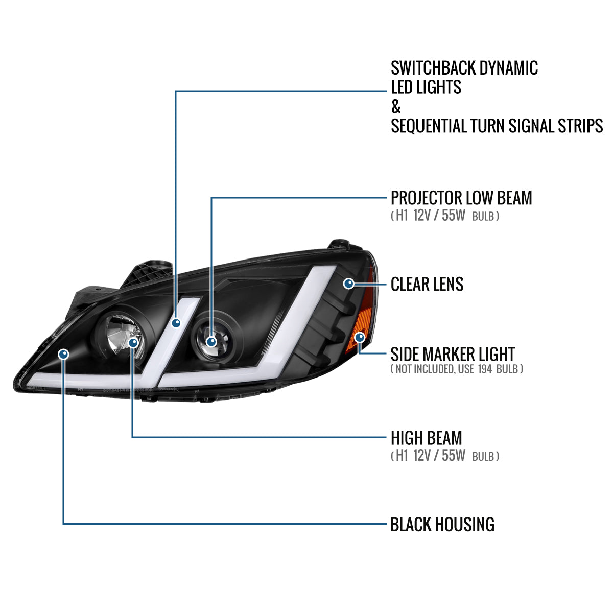Ronnin - Fits 2005-2010 Pontiac G6 Projector Headlights LED Running Lights Switchback Sequential Turn Signals + Animated Startup Effect Parking Assembly Pair | Black