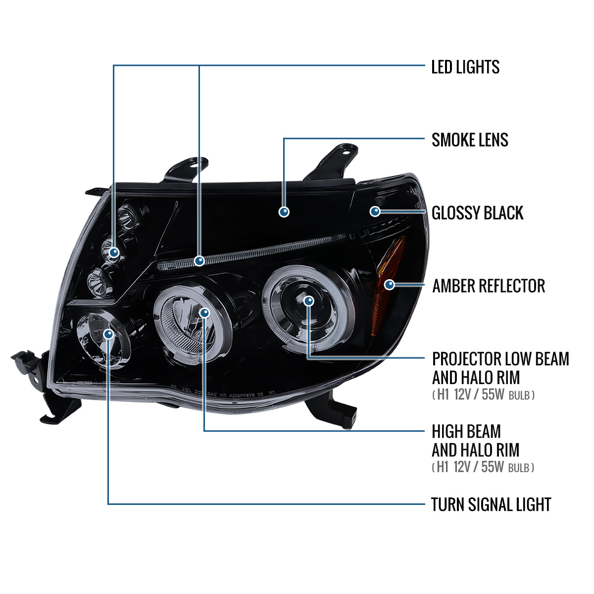 Ronnin - Fits 2005-2011 Toyota Tacoma Upgraded Assembly LED Dual Rims Projector Headlights Pair | Black Smoke