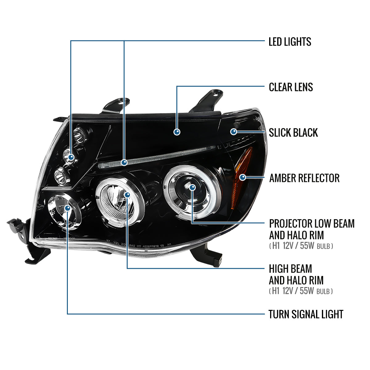 Ronnin - Fits 2005-2011 Toyota Tacoma Upgraded Assembly LED Dual Rims Projector Headlights Pair | Gloss Black