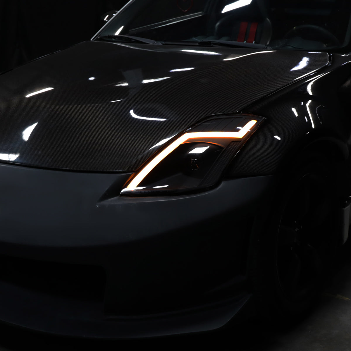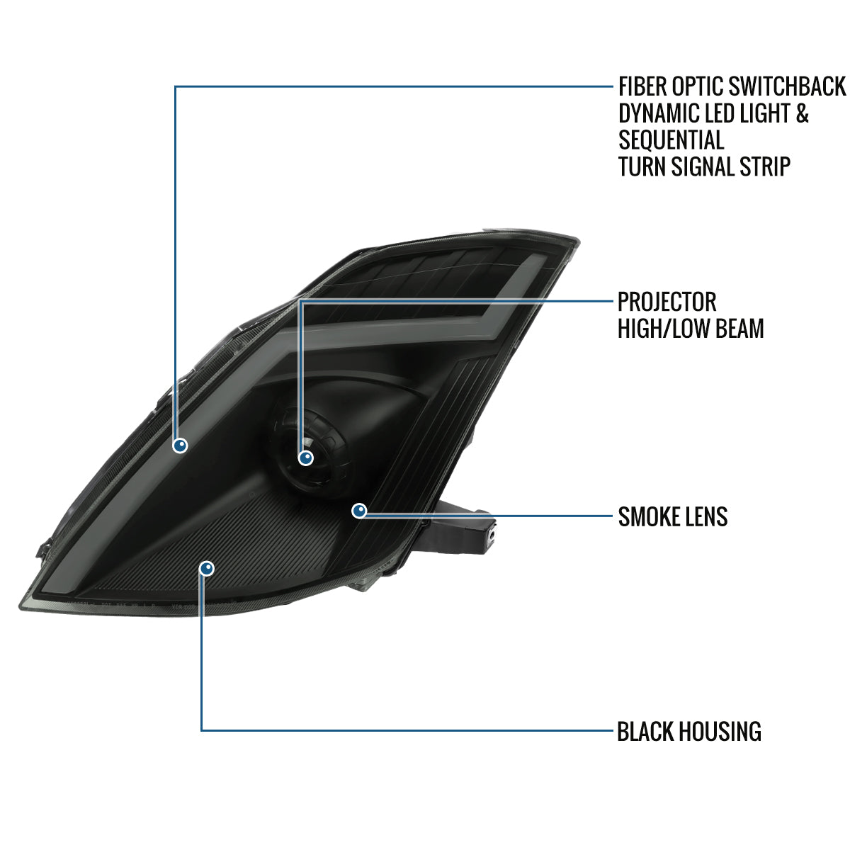 Ronnin - Fits 2006-2009 Nissan 350Z Upgraded Replacement HID Xenon Projector Headlights LED Switchback Sequential Turn Signals + Animated Startup Effect Assembly Pair | Black Smoke
