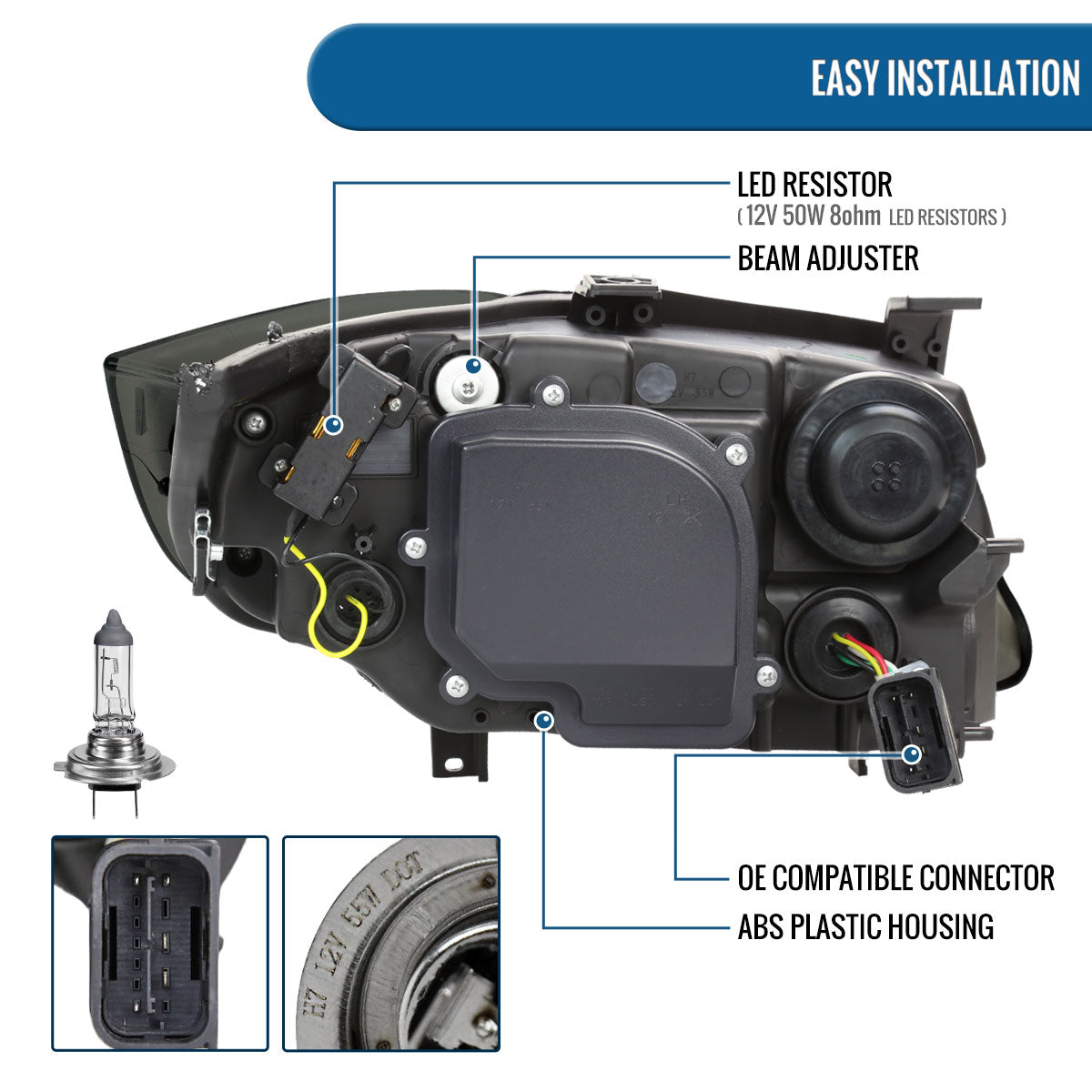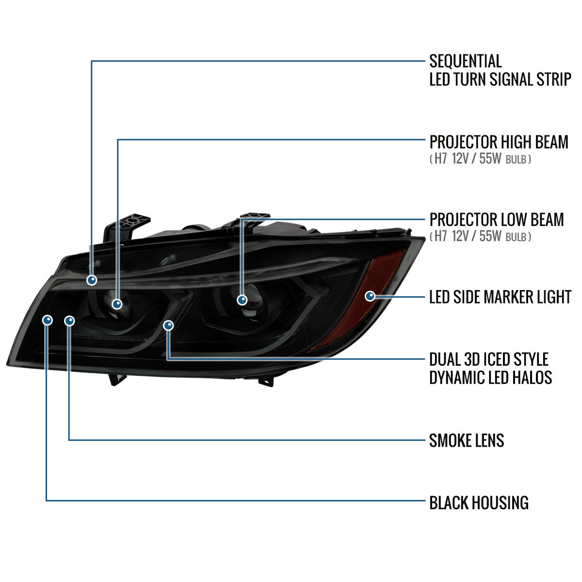 Ronnin - Fits 2006-2011 BMW 3-Series 325i 328i 330i E90 E91 Upgraded Dual Projector Halogen Headlights LED Sequential Turn Signals + Animated Startup Pair | Black Smoke