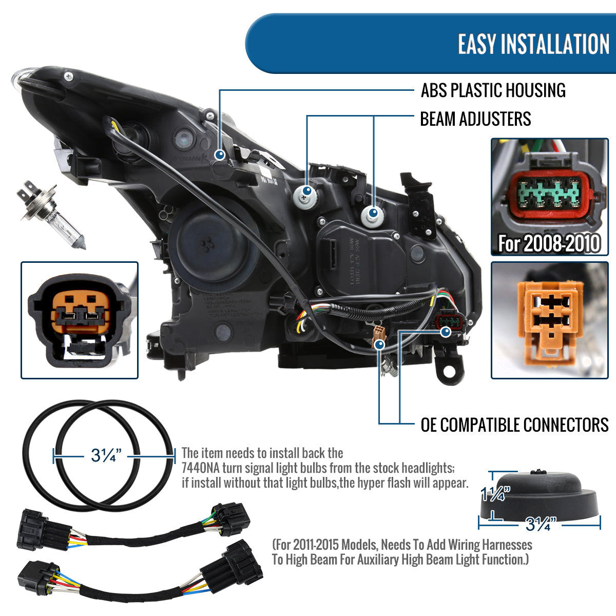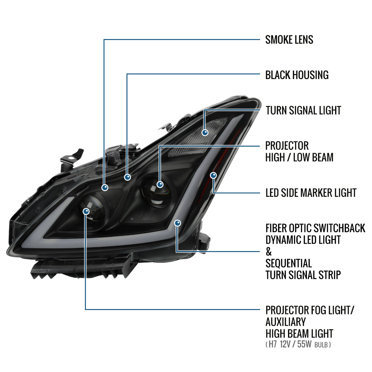 Ronnin - Fits 2008-2013 Infiniti G37 2014-2015 Infiniti Q60 Coupe Fog + Dual Beam Projector Headlights Switchback LED Sequential Signal + Animated Startup Effect Pair | Black Smoke
