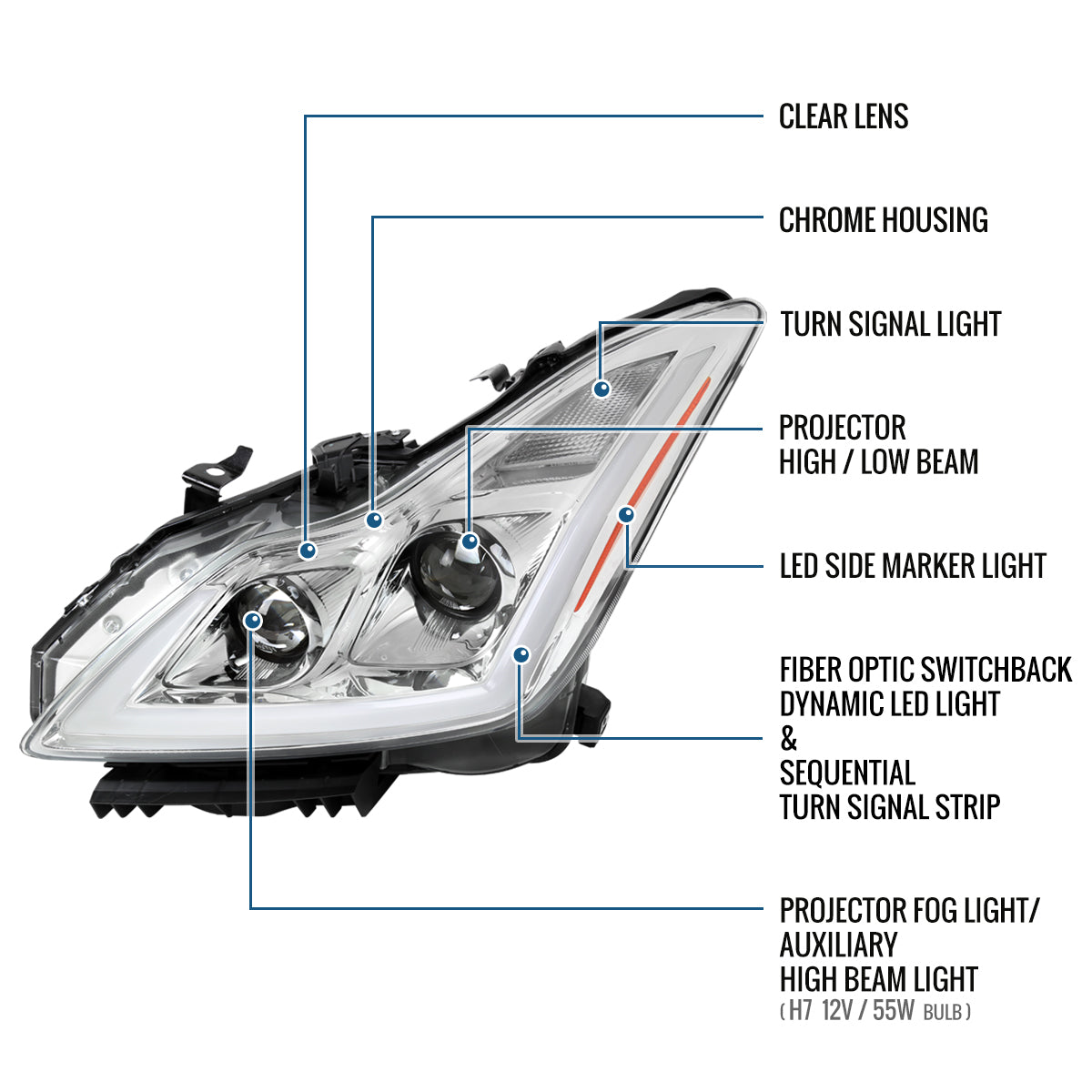 Ronnin - Fits 2008-2013 Infiniti G37 2014-2015 Infiniti Q60 Coupe Fog + Dual Beam Projector Headlights Switchback LED Sequential Signal + Animated Startup Effect Pair | Chrome