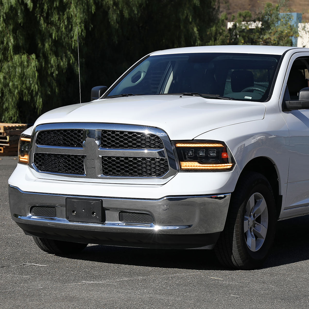 Ronnin - Fits 2009-2018 Ram 1500 2500 3500 Upgraded Amber Running Lights Full LED Triple Projector Headlights Switchback Sequential Signal + Animated Startup Effect Pair | Black