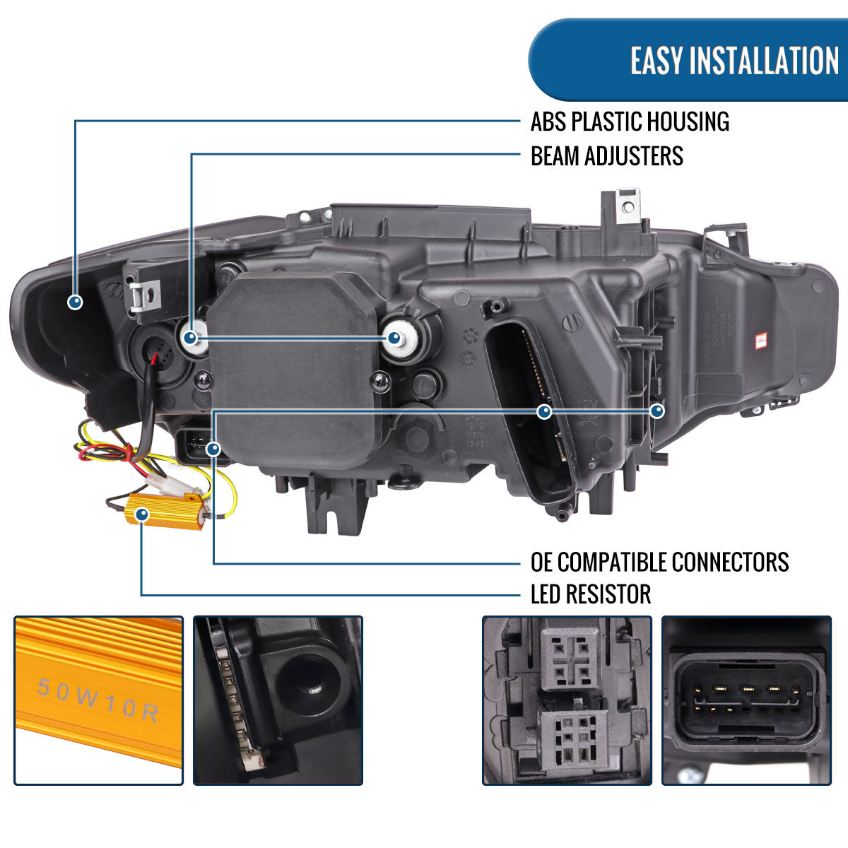 Ronnin - Fits 2012-2015 BMW F30 3-Series Sedan 328i 335i 320i Xenon Non-AFS Upgraded U-Shaped LED Tube Projector Headlights Assembly Pair | Black Smoke