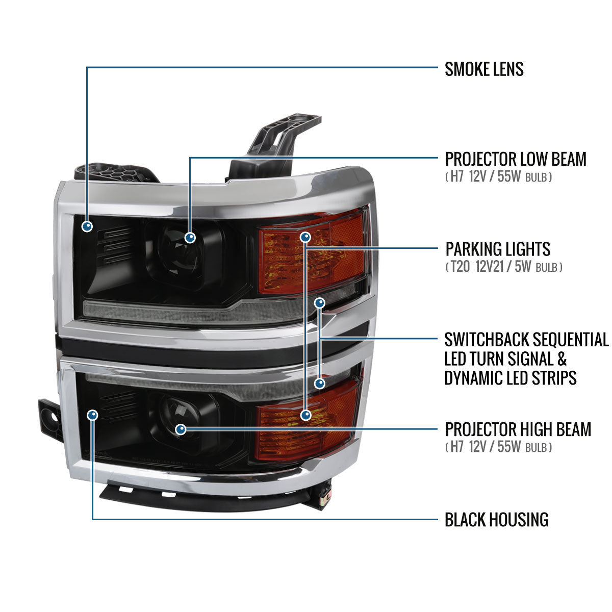 Ronnin - Fits 2014-2015 Chevy Silverado 1500 Upgraded Dual Projector Headlights LED Switchback Sequential Turn Signals + Animated Startup Effect Assembly Pair | Black Smoke | Chrome Trim