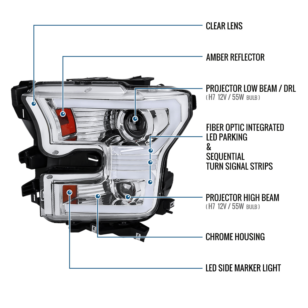 Ronnin - Fits 2015-2017 Ford F150 Halogen Dual Projector Headlights LED DRL Switchback Sequential Turn Signals With 2 Lighting Patterns Assembly Pair | Chrome