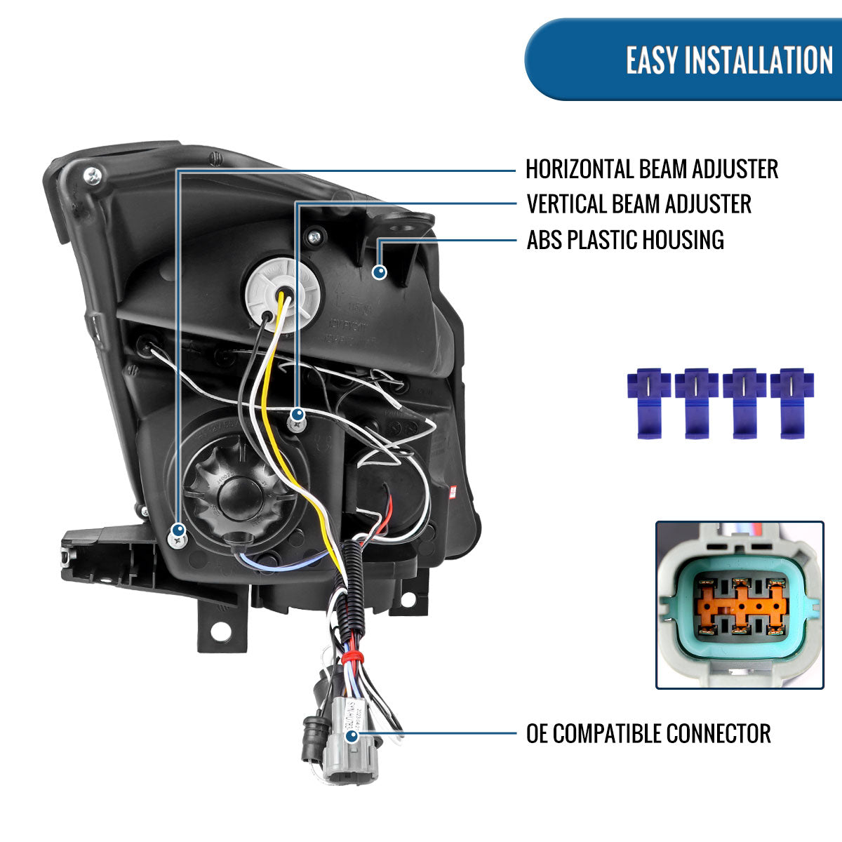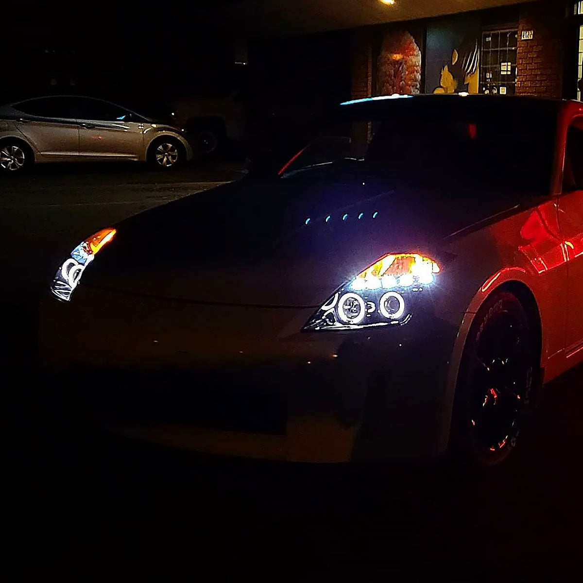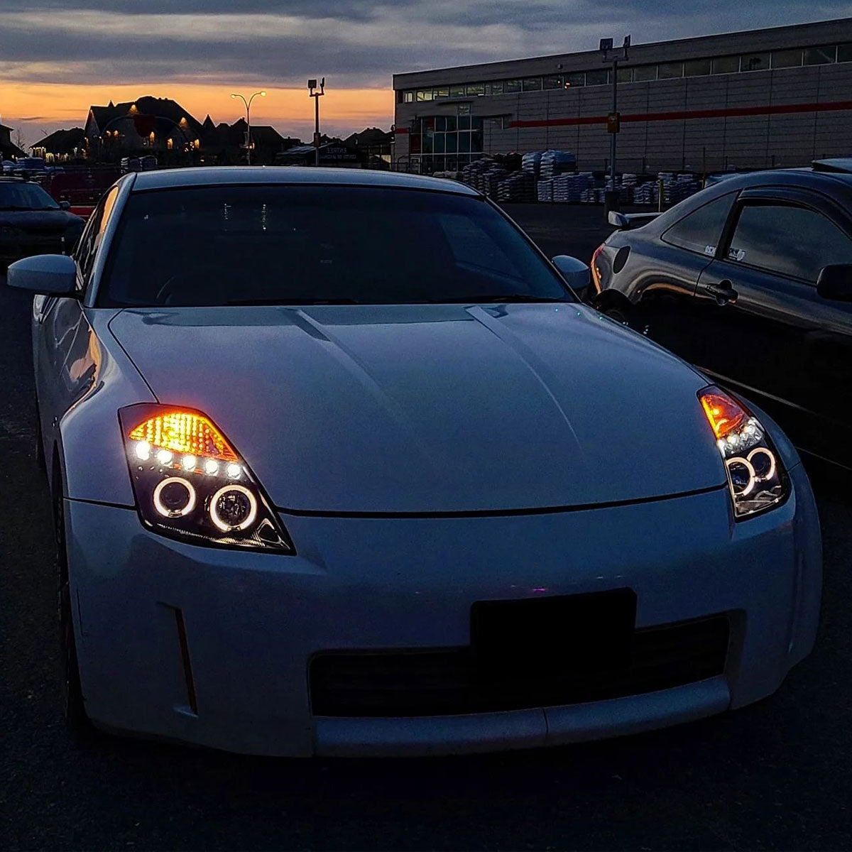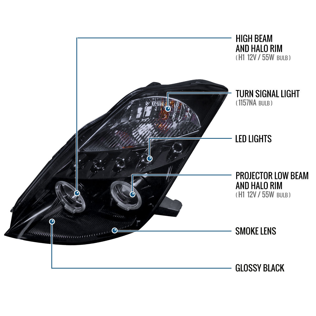 Ronnin - Fits 2003-2005 Nissan 350Z Upgraded Replacement LED Dual Halo Rims Running Lights Halogen Projector Headlights Assembly Pair | Black Smoke