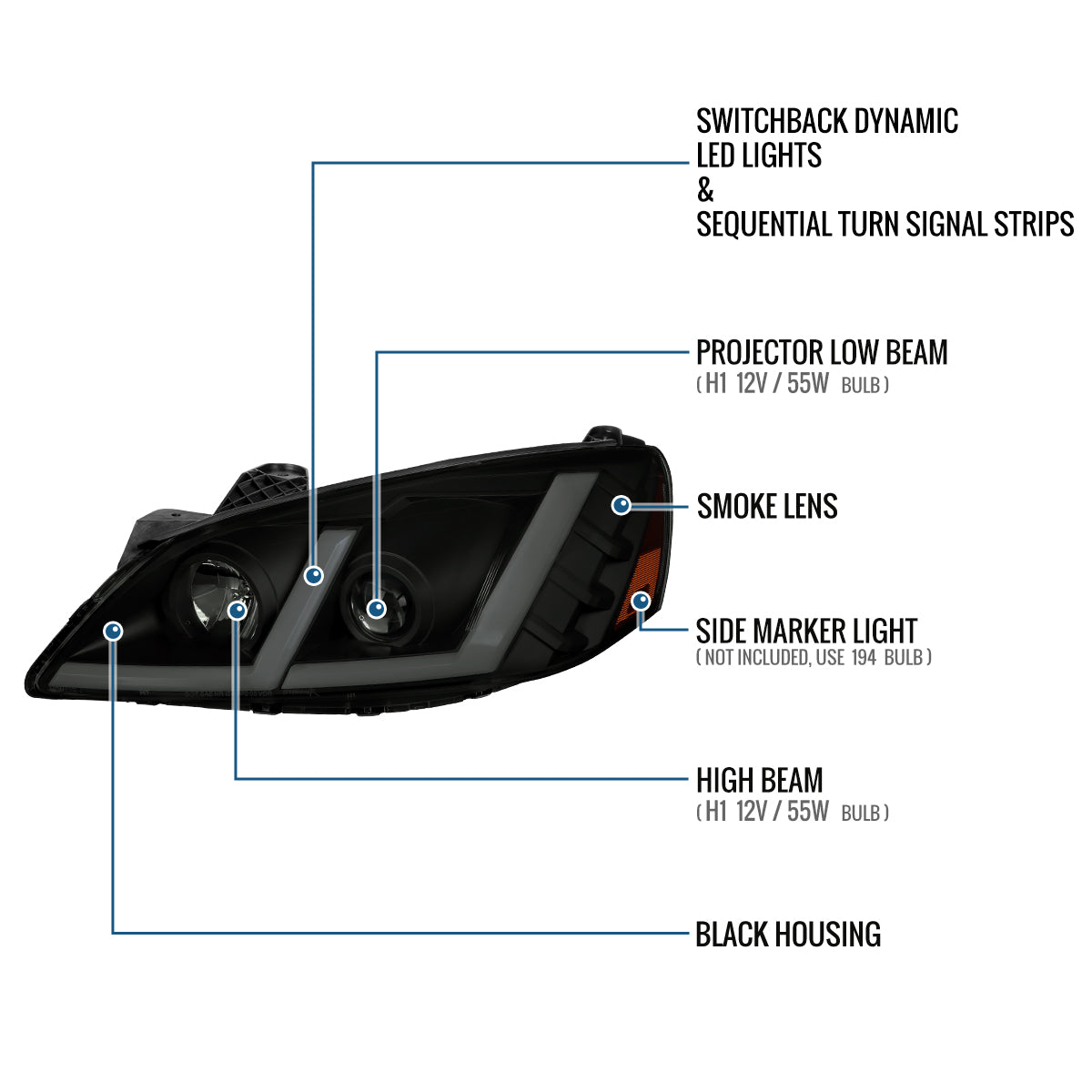 Ronnin - Fits 2005-2010 Pontiac G6 Projector Headlights LED Running Lights Switchback Sequential Turn Signals + Animated Startup Effect Parking Assembly Pair | Black Smoke