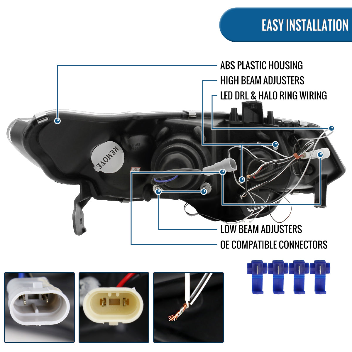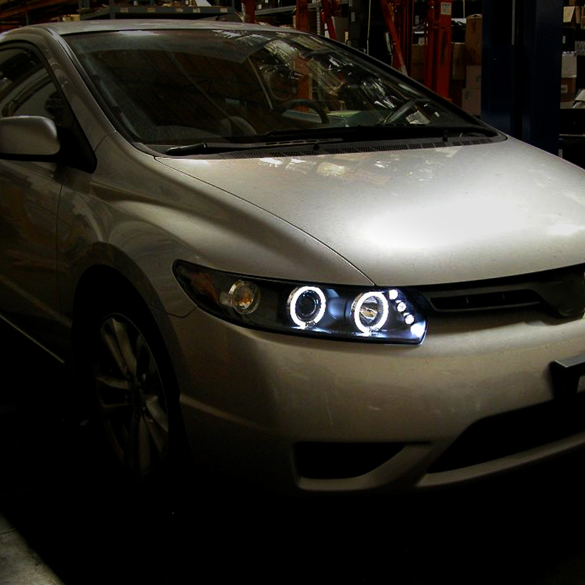 Ronnin - Fits 2006-2011 Honda Civic 2Dr Coupe LED Angel Eyes Dual Halo Rims Projector Headlights Replacement Pair | Black