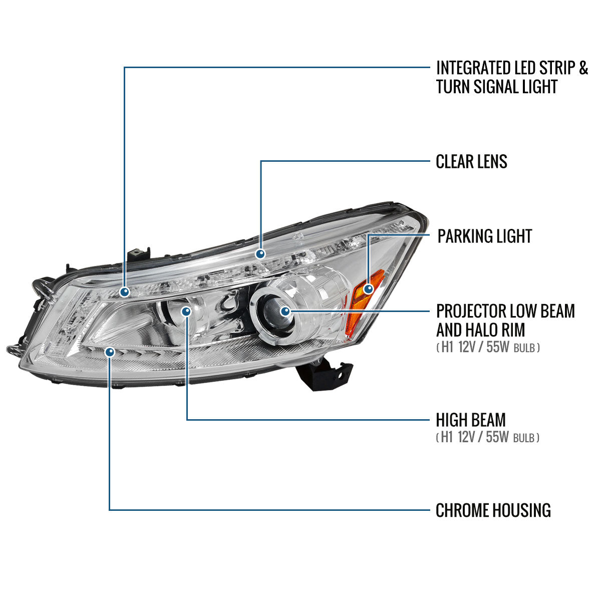 Ronnin - Fits 2008-2012 Honda Accord 4Dr Sedan Projector Headlights Integrated Bright LED Strip Running Lights and Turn Signal Assembly Pair | Chrome