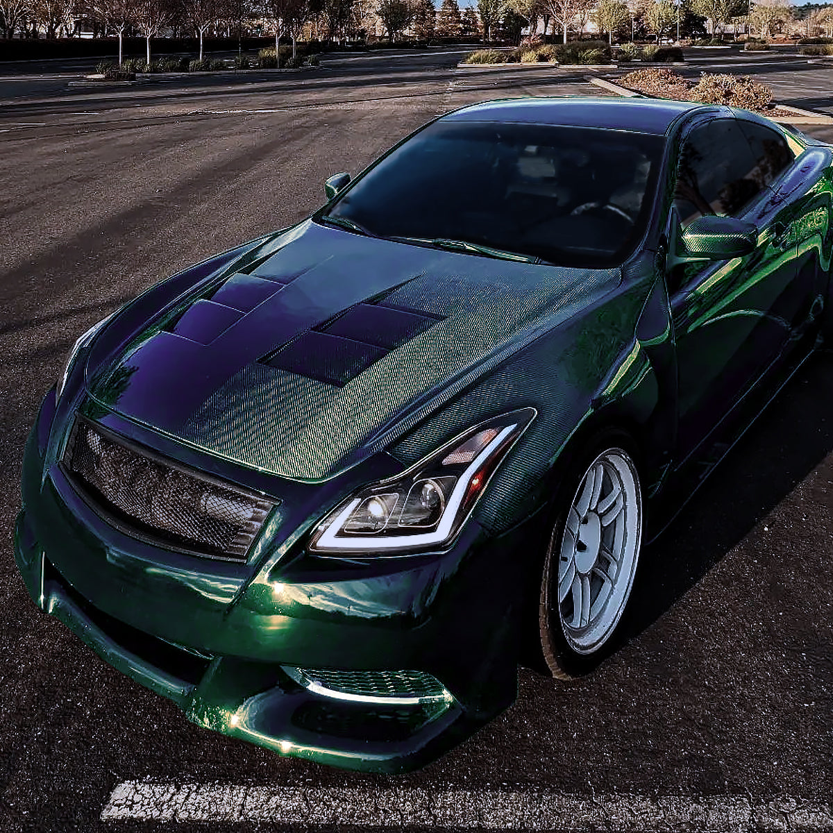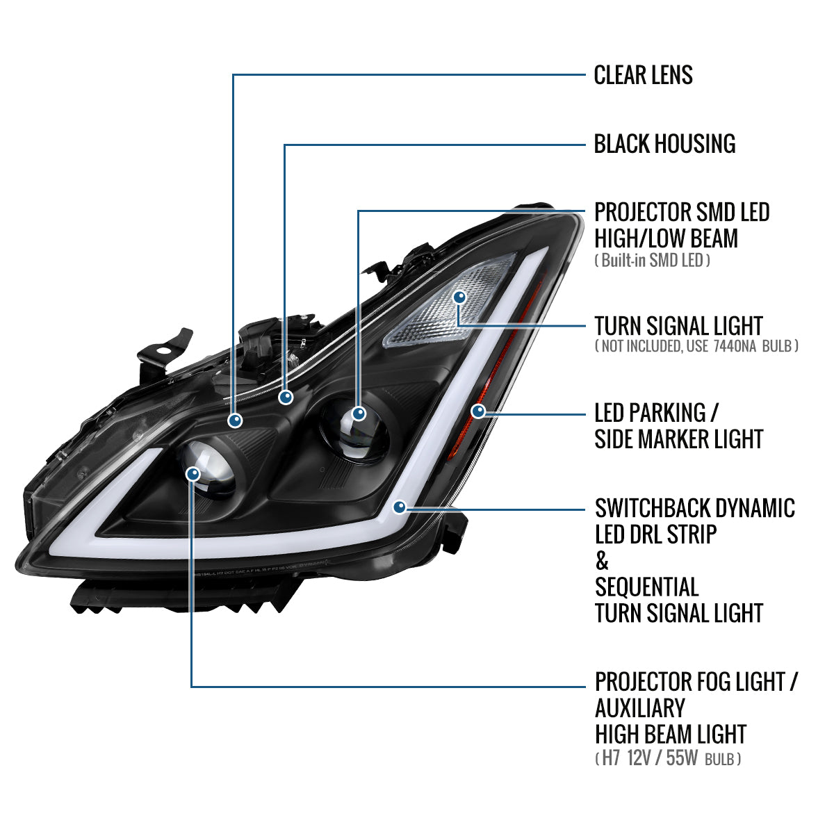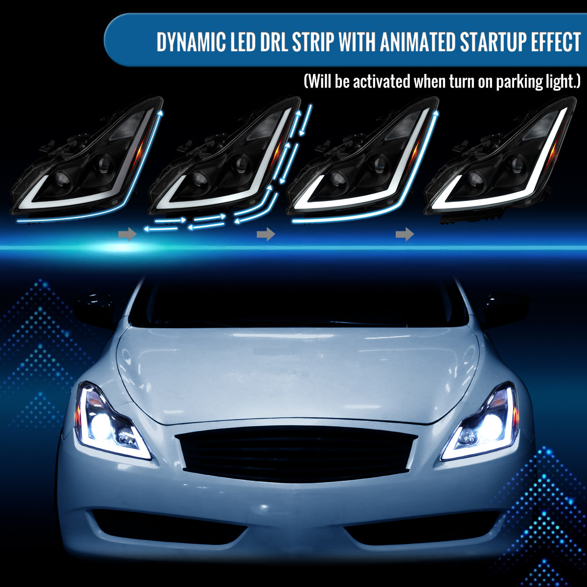 Ronnin - Fits 2008-2013 Infiniti G37 2014-2015 Q60 Coupe LED Dual Beam Projector Headlights + Halogen Projector Fog Switchback Sequential Signals + Animated Startup Effect Pair | Black