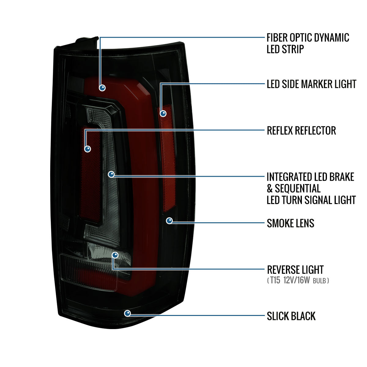 Ronnin - Fits 2007-2014 Chevy Tahoe Suburban GMC Yukon Denali XL Tail Lights LED Integrated Brake and Sequential Turn Signals + Animated Startup Effect Assembly Pair | Black Smoke