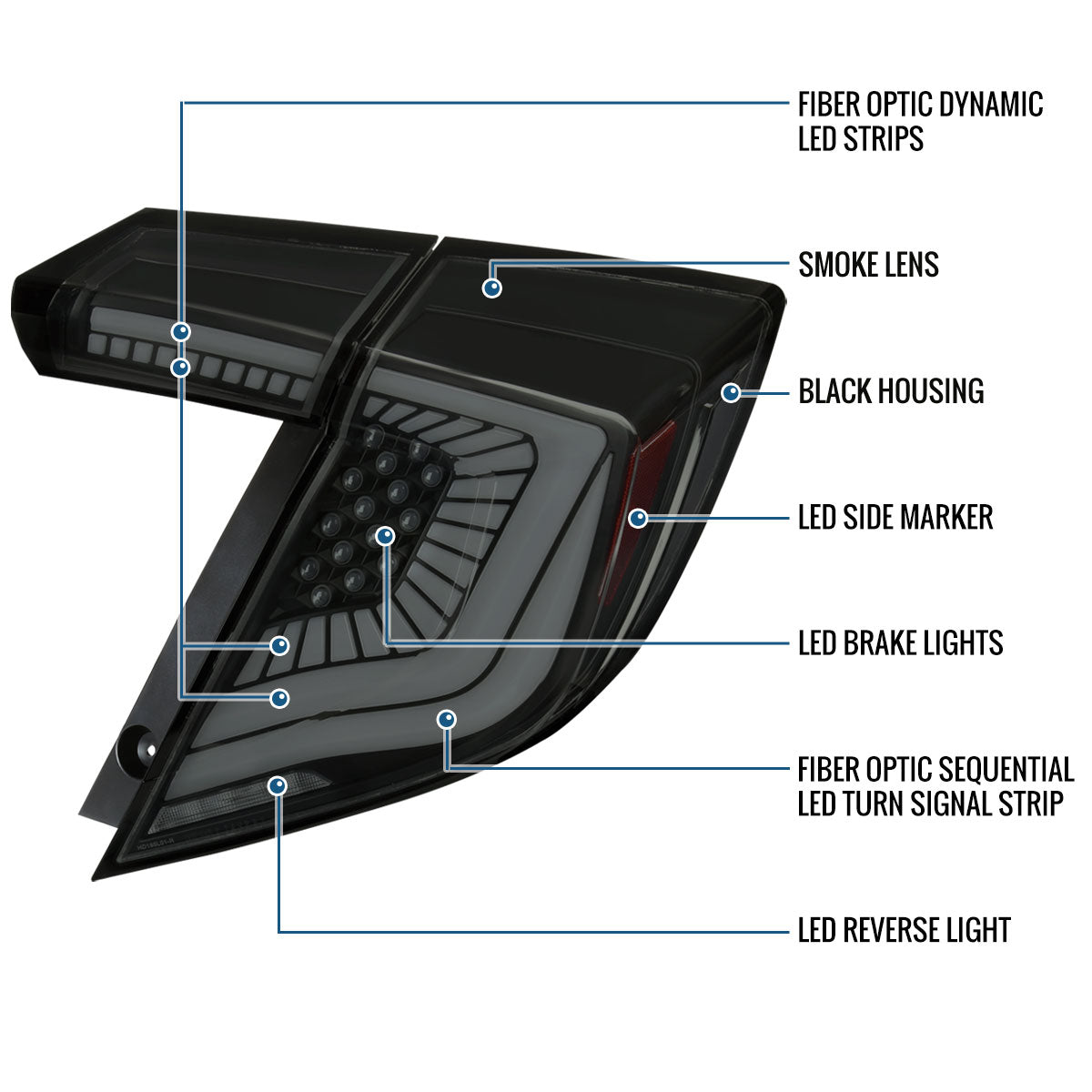 Ronnin - Fits 2017-2021 Honda Civic Hatchback Full LED Tail Lights Animated Startup Effect + Sequential Signal Lamps Replacement Pair | Black Smoke | White Tube