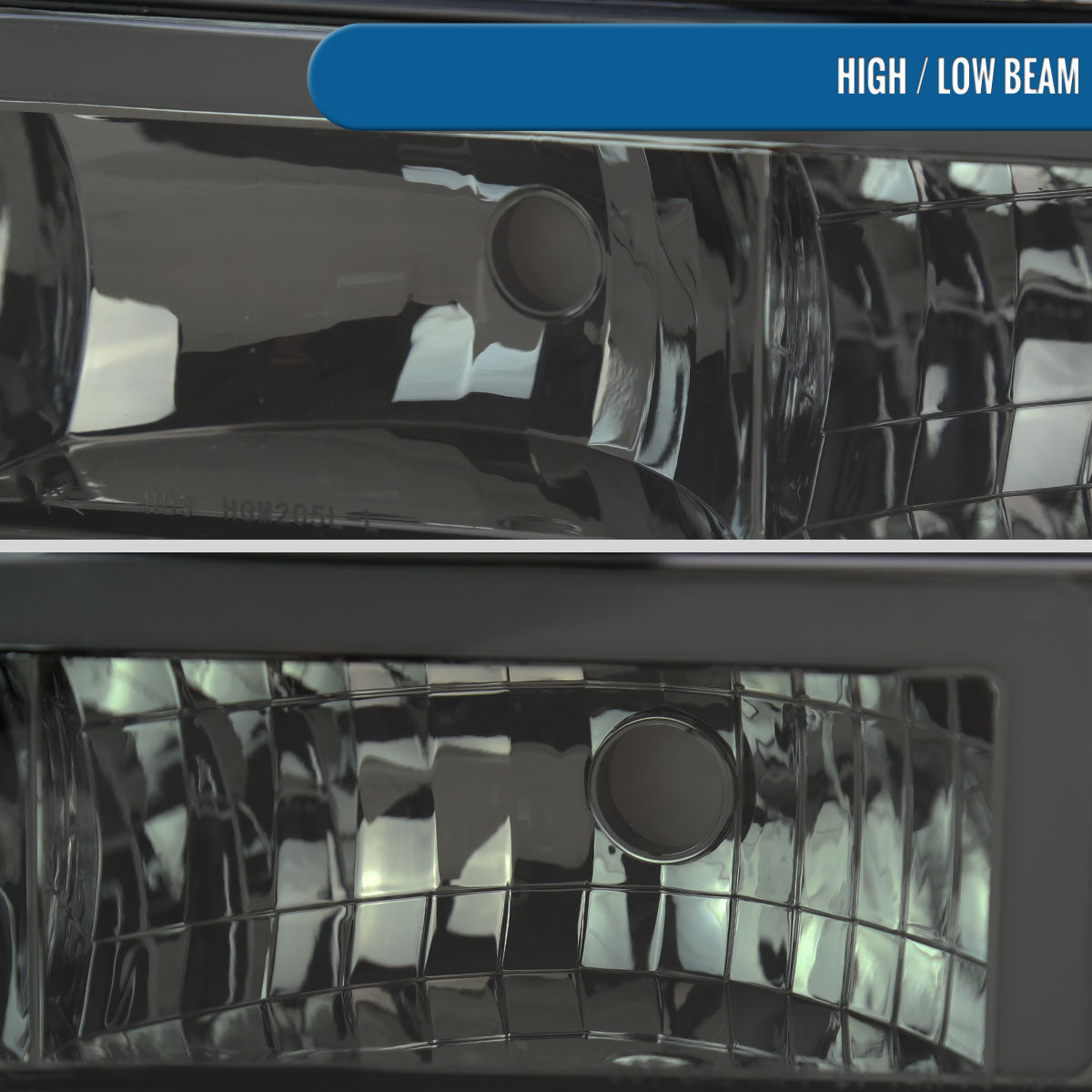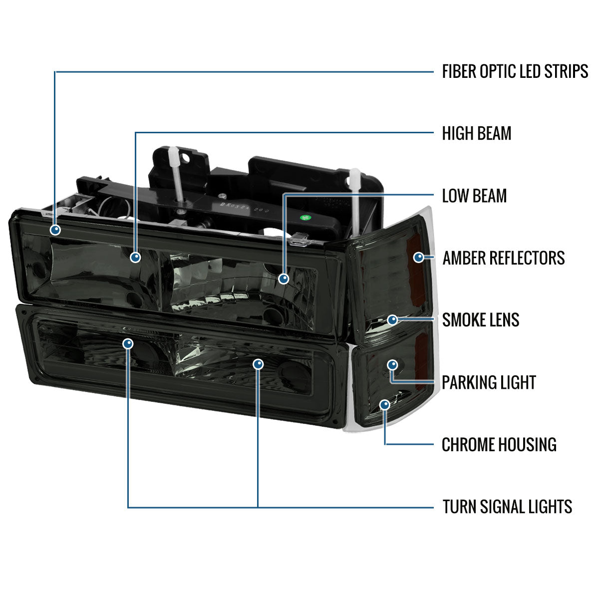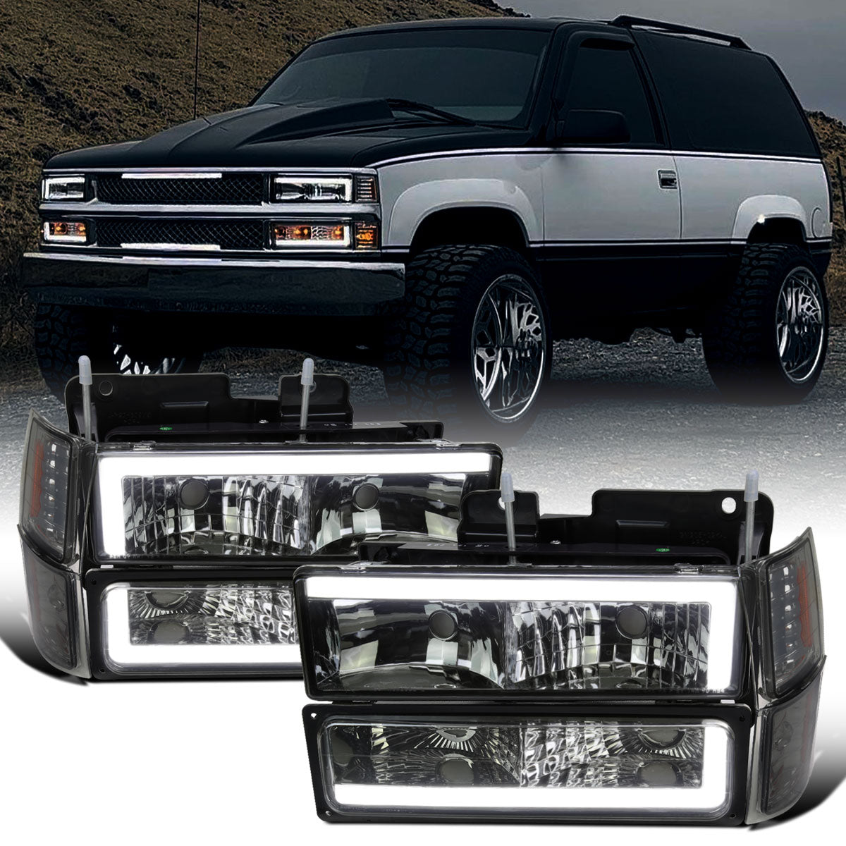 Ronnin - Fits 1994-1998 Chevy C10 C/K Silverado Suburban Tahoe LED Tube Headlights + Corner Bumper Parking Lights Assembly Pair | Smoke