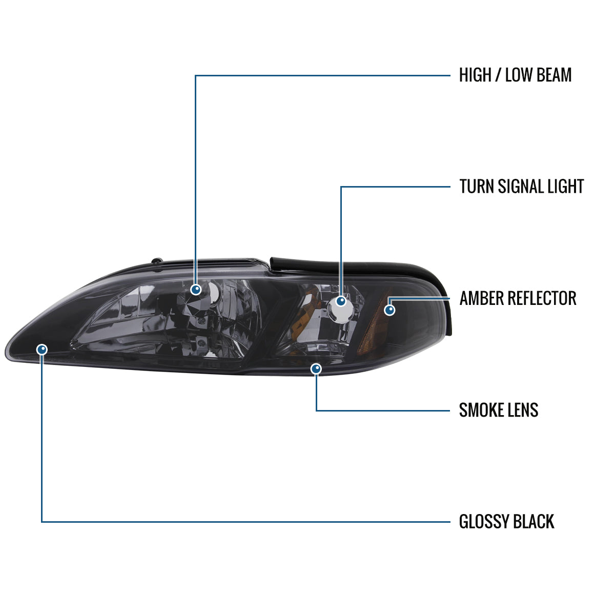Ronnin - Fits 1994-1998 Ford Mustang All-in-One Replacement Headlights + Corner Lights Assembly Pair | Black Smoke