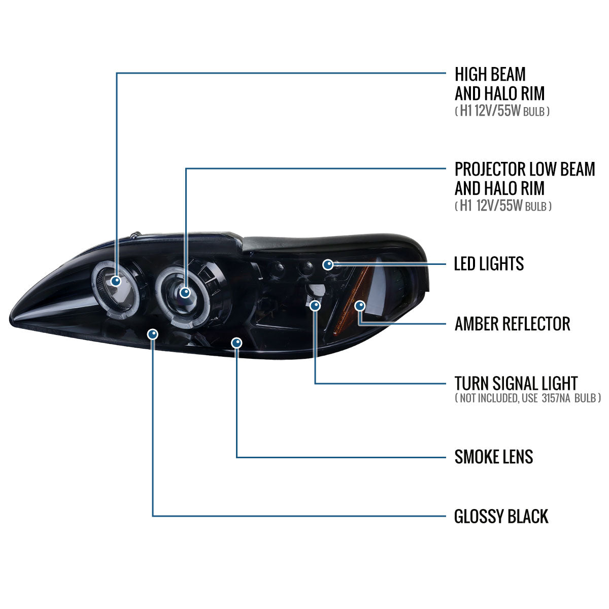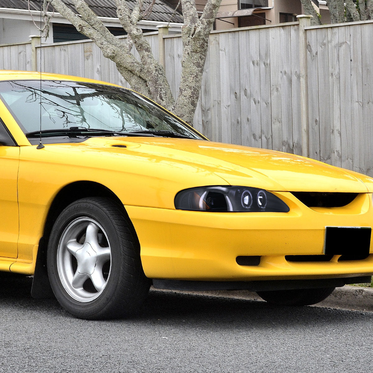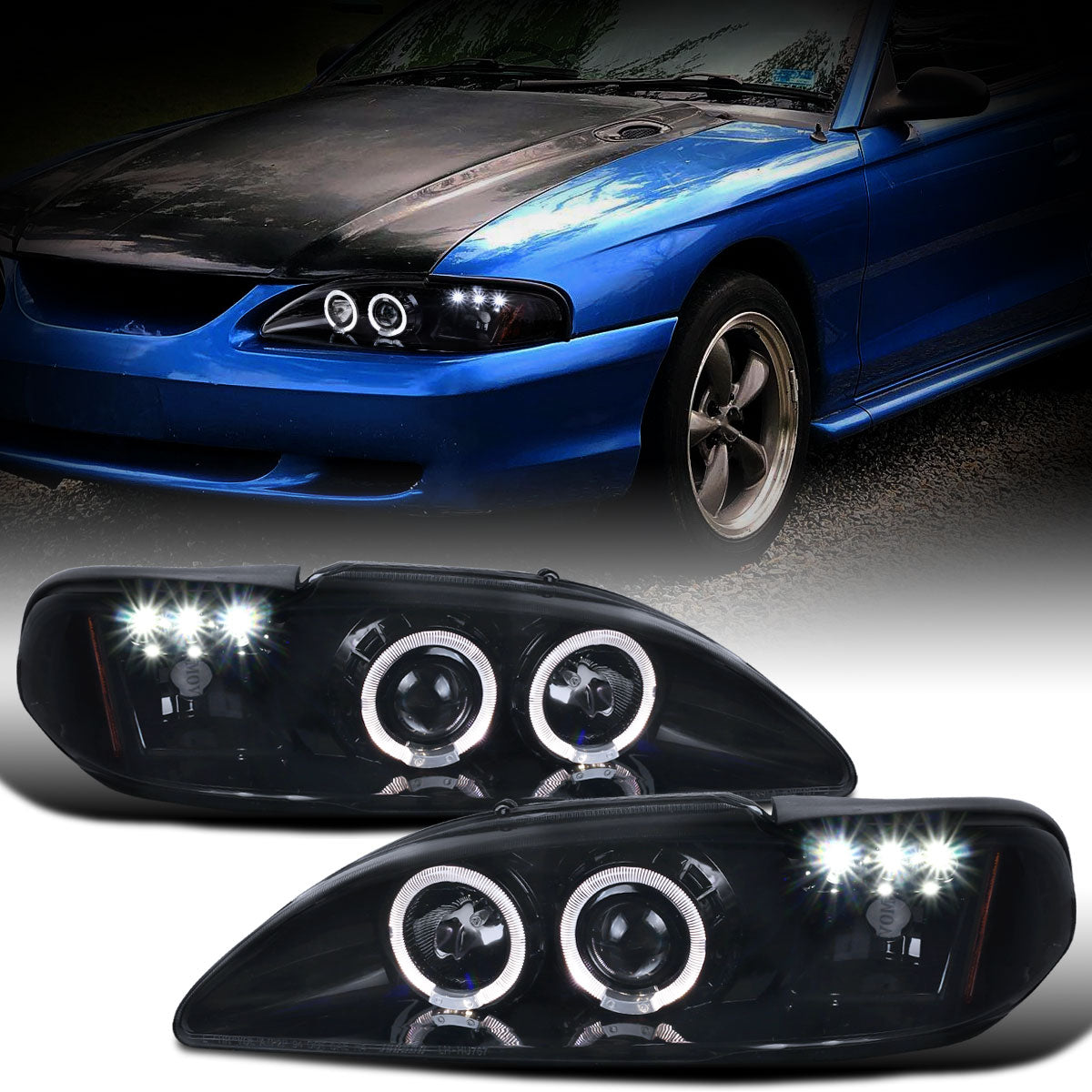Ronnin - Fits 1994 -1998 Ford Mustang LED Angel Eyes Dual Halo Rims Projector Headlights Replacement Assembly Pair | Black Smoke