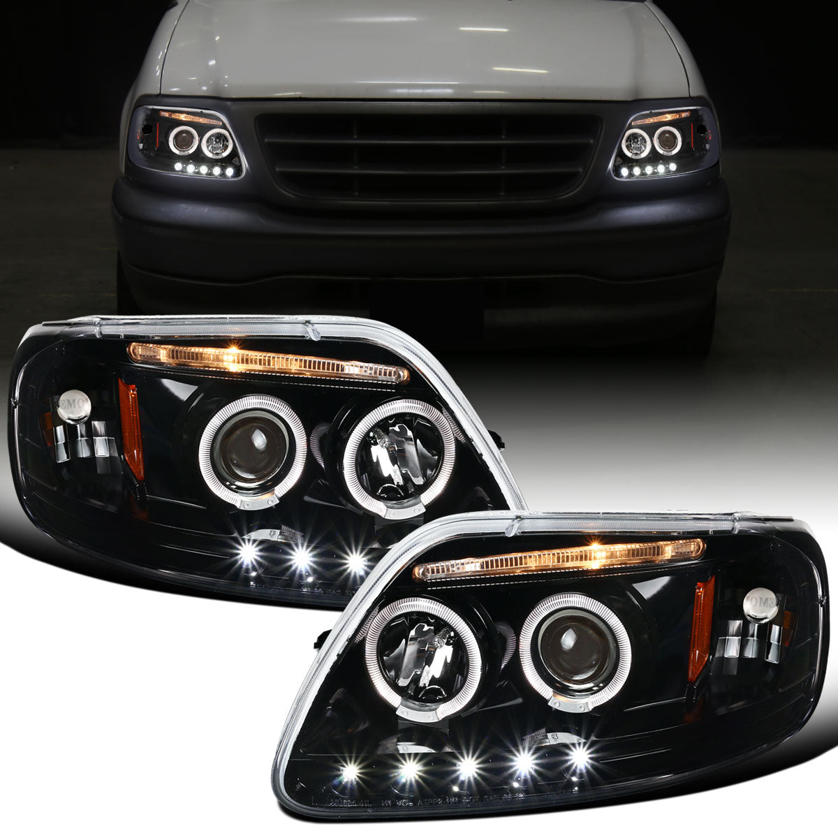 Ronnin - Fits 1997-2004 Ford F150 1997-2002 Ford Expedition Upgrade Replacement LED Dual Rims Projector Headlights Assembly Pair | Gloss Black