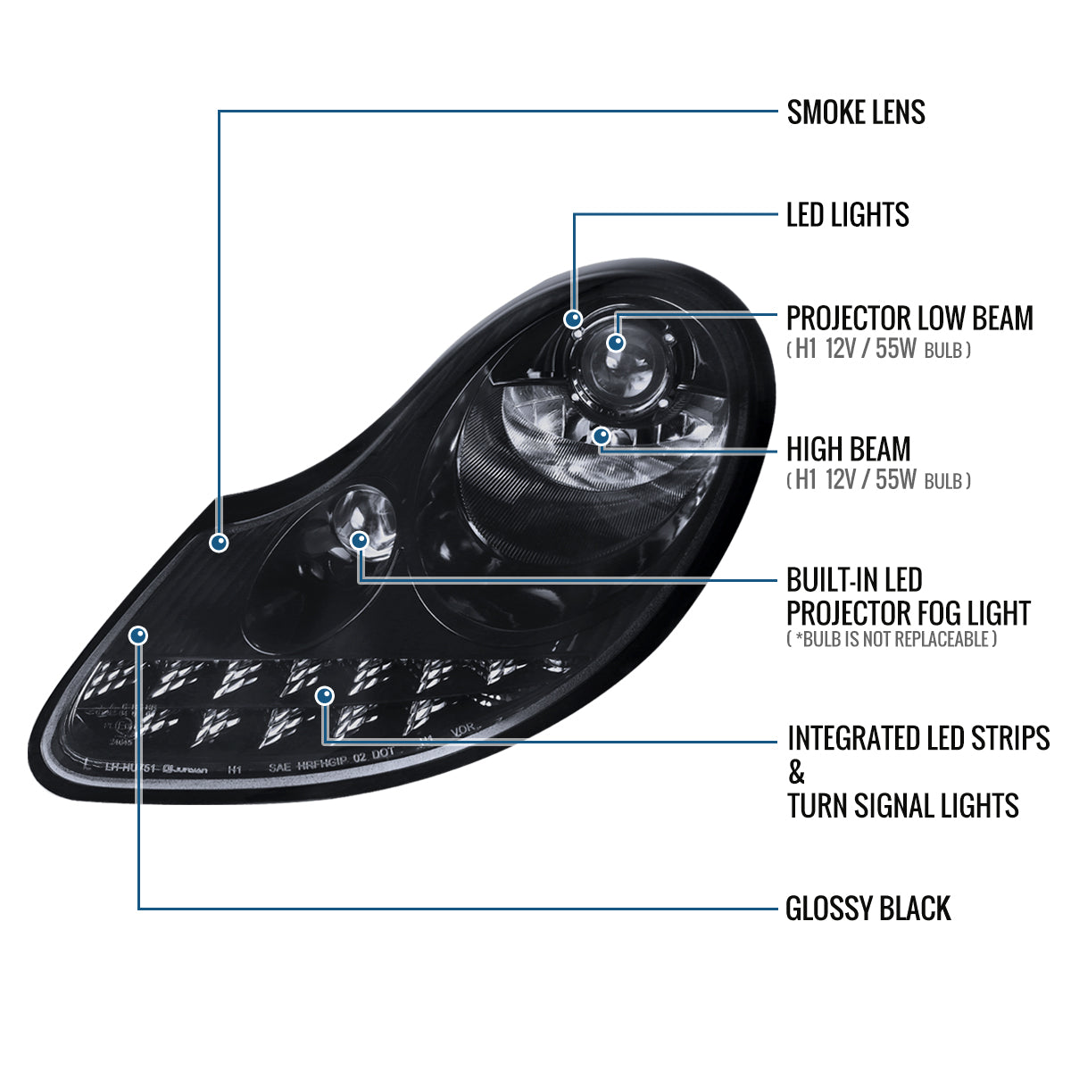 Ronnin - Fits 1997-2004 Porsche Boxster 1997-2001 Porsche 911 Upgrade Assembly LED Running Lights Projector Headlights Pair | Black Smoke