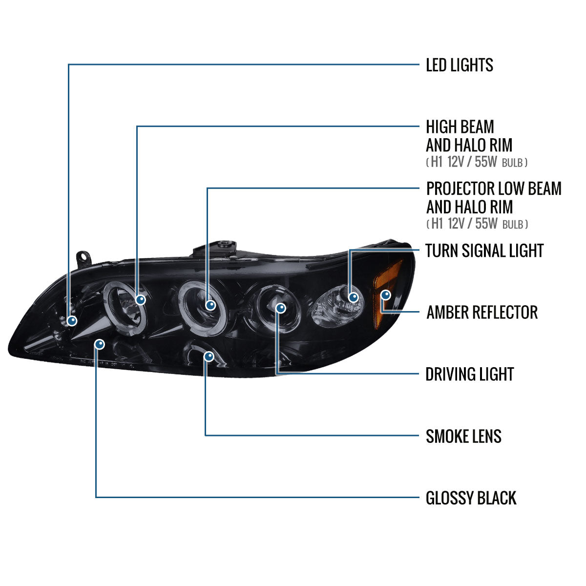 Ronnin - Fits 1998-2002 Honda Accord Sedan Coupe Upgrade Replacement LED Dual Rims Projector Headlights Assembly Pair | Black Smoke
