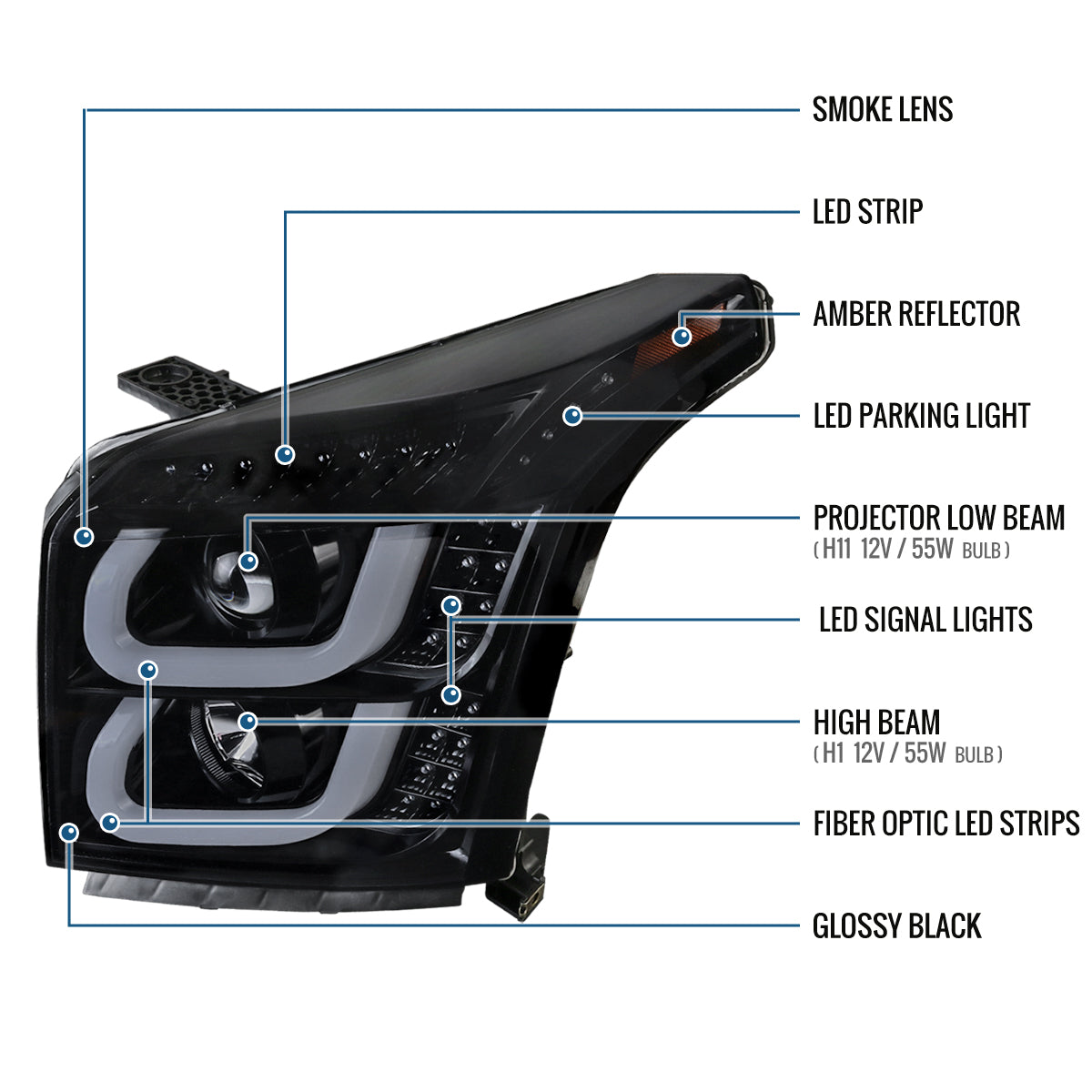 Ronnin - Fits 2015-2020 GMC Yukon/Yukon XL Upgrade Replacement LED Running Turn Signals Projector Headlights Assembly Pair | Black Smoke