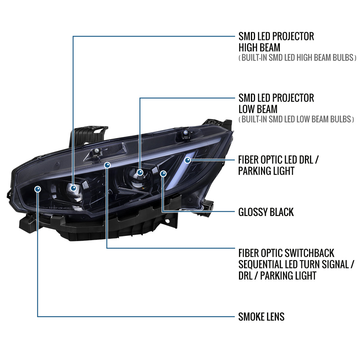 Ronnin - Fits 2016-2021 Honda Civic Full LED Upgrade Replacement For LED Type DRL Switchback Sequential Turn Signals Dual Projector Headlights Assembly Pair | Black Smoke
